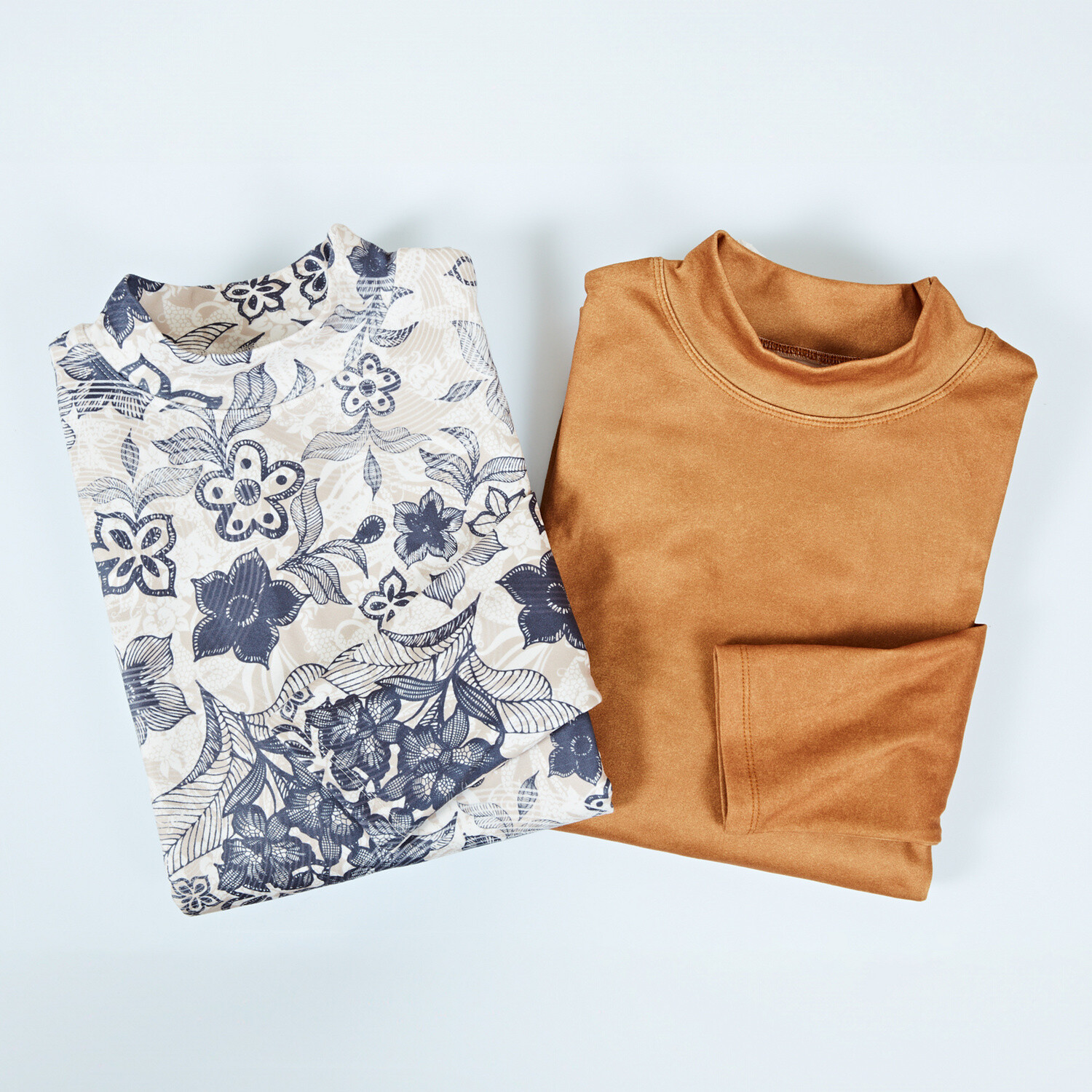 Bluze elegante cu guler înalt - 1x uni și 1x cu imprimeu la modă. Moale, fluidă și foarte plăcută de purtat, foarte elastică și se mulează pe corp. Se poate spăla la 30 °C. 1x simplă + 1x cu model. Foarte fină. Întreținere ușoară + își păstrează forma. Set de 2 buc.