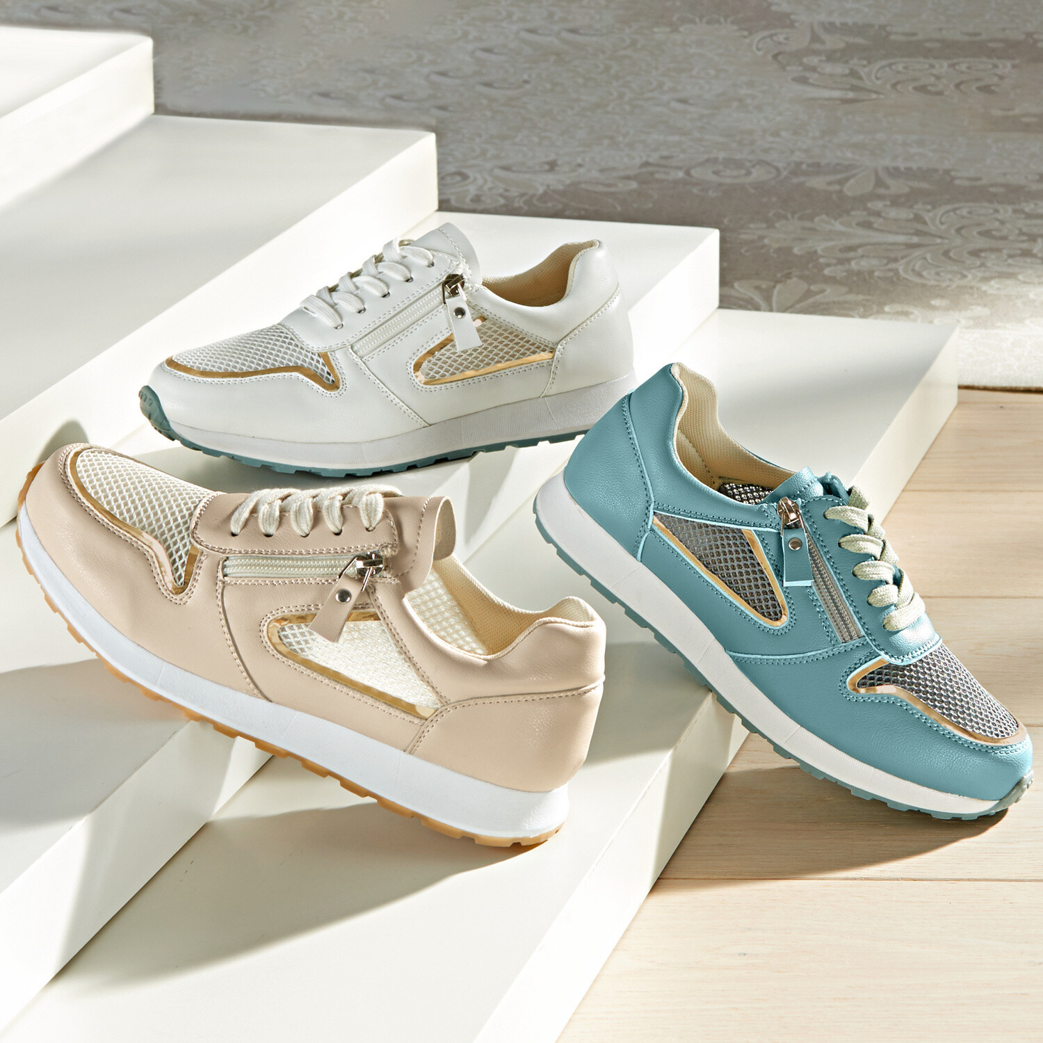 Într-un amestec sofisticat de materiale cu accente de brevet și crocodil - stil strălucitor, confort foarte elastic și fără presiune. Se pot deschide larg cu o curea Velcro largă și sunt ușor de încălțat. Talpă cu talpă cu amortizare bună. Toc cu pană aprox. 4 cm.
