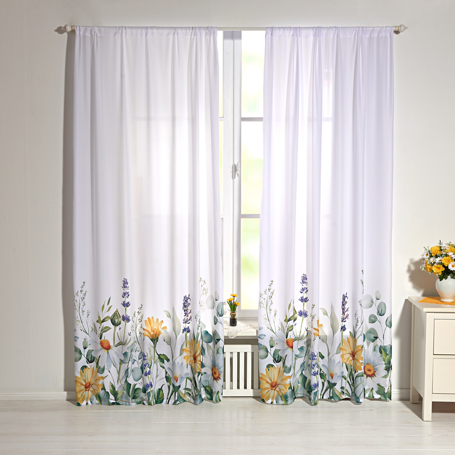 Cu această perdea florală, vara vine la tine. Strălucește ca mătasea, are ochiuri și o margine derulată - frumos colorată și necesită puțină întreținere. Se poate spăla la 30 °C.