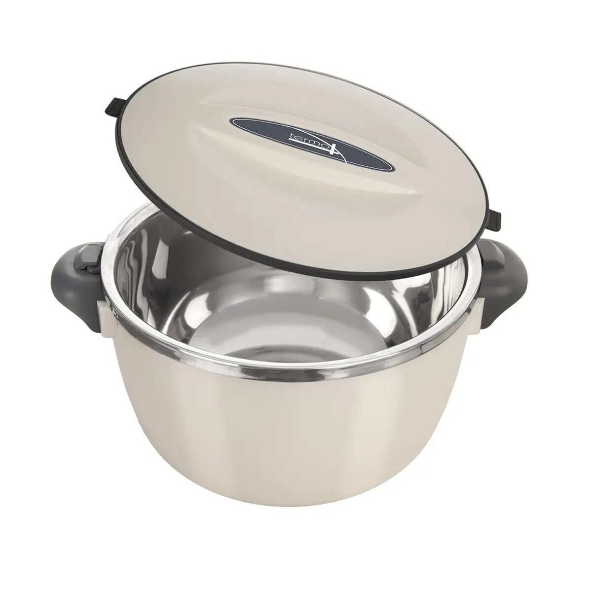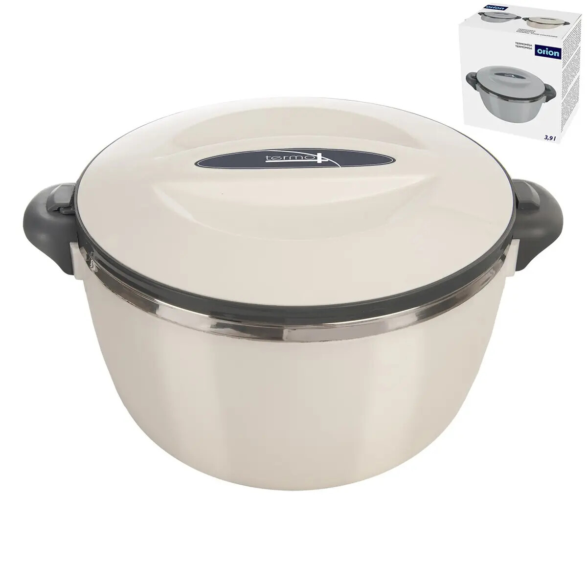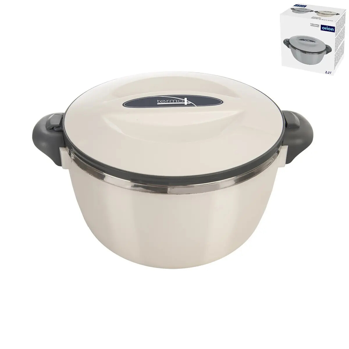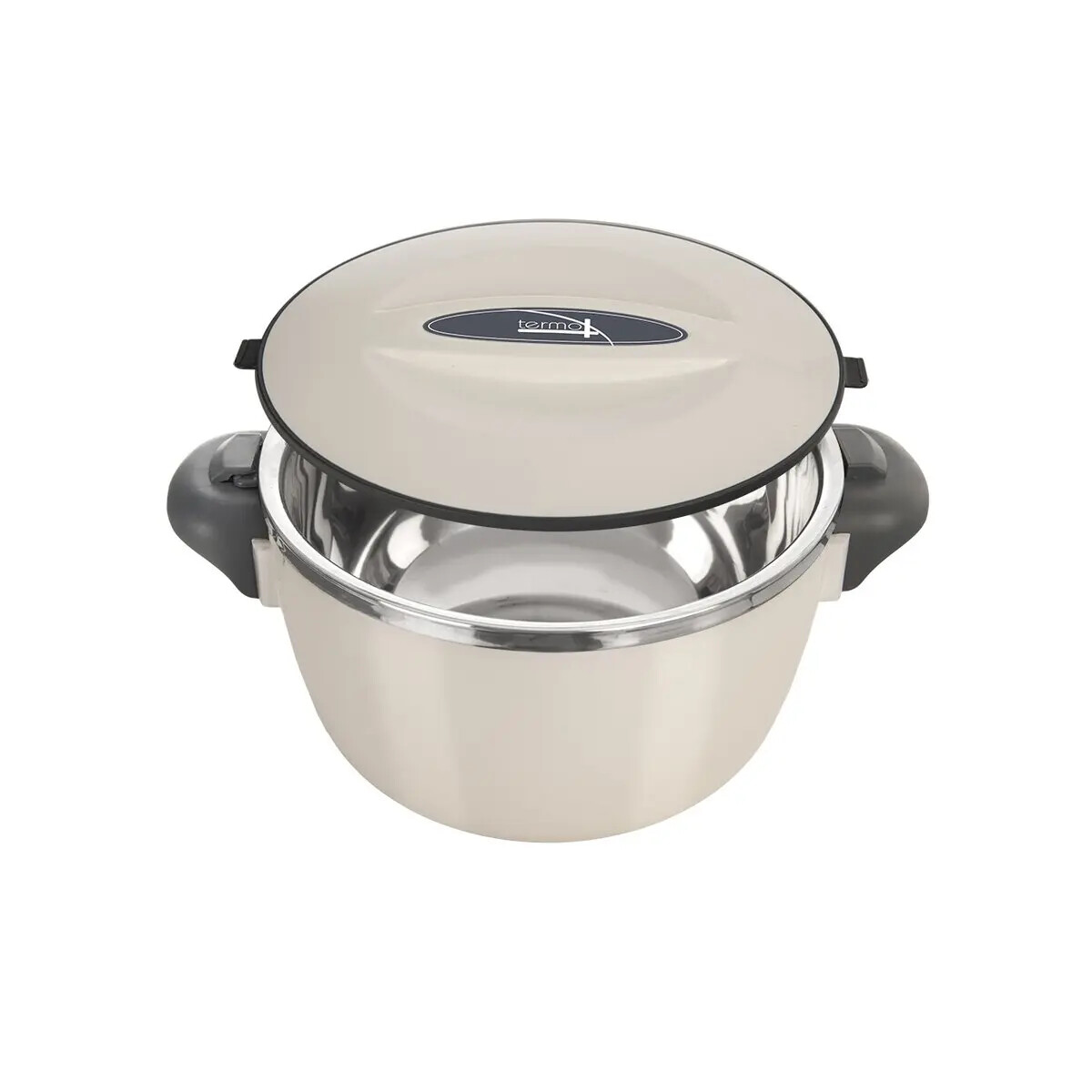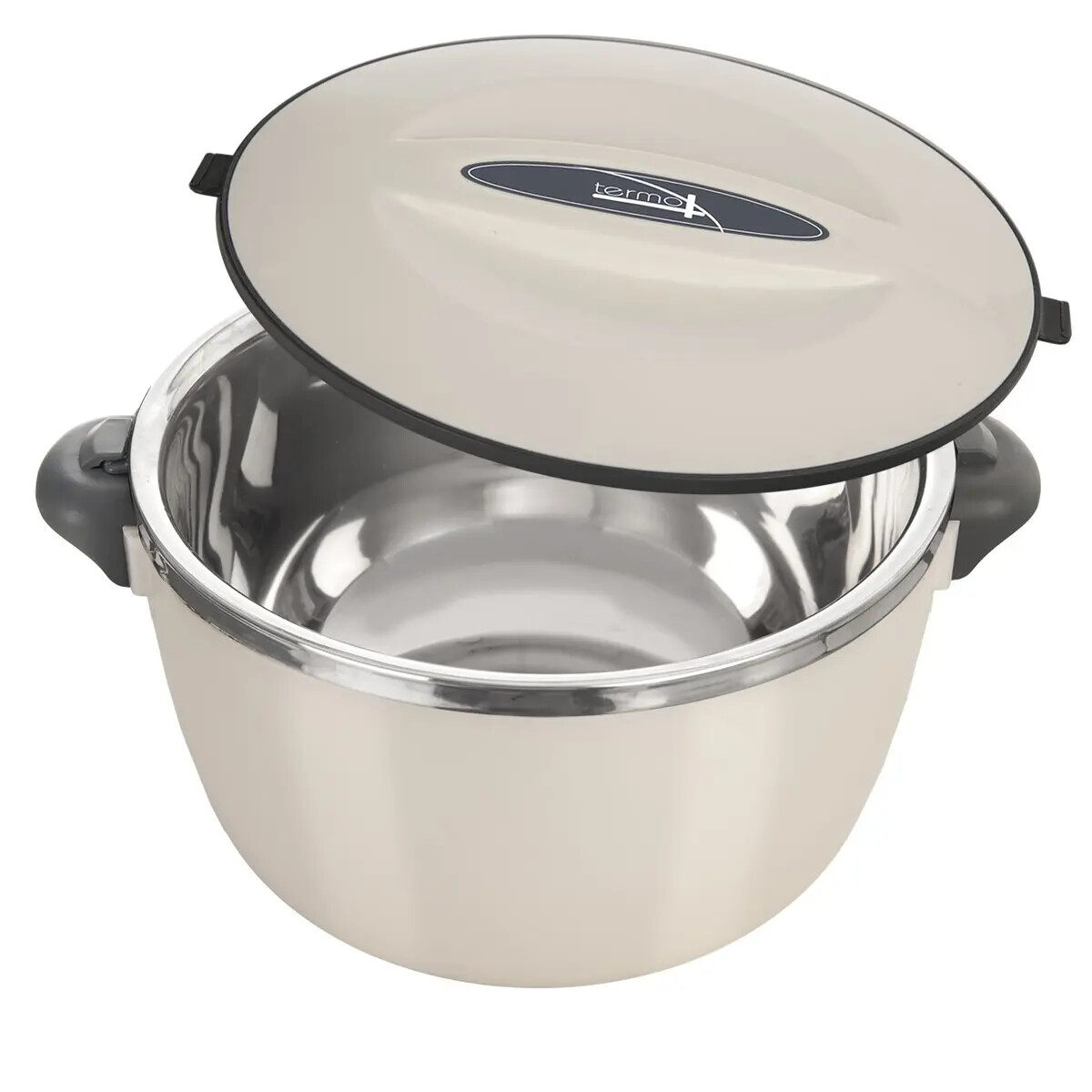 Bolul termoizolant cu înveliș din plastic și interior din oțel inoxidabil menține preparatul introdus cald sau rece pentru o perioadă lungă de timp. Închidere ușoară prin rotirea capacului termo din plastic. Poate fi folosit acasă, la serviciu sau în călătorii, vara și iarna. Excelente proprietăți de izolare. Ușor și ușor de transportat. Suprafața netedă se curăță ușor. Ideal pentru înghețată în zilele fierbinți de vară. Timpul de menținere a temperaturii depinde de temperatura ambientală și de diferența dintre temperatura din interior și cea exterioară. Înainte de a introduce alimente reci (de ex. înghețată), pune recipientul aproximativ o oră în frigider pentru a prelungi efectul de răcire. Pentru alimente calde, toarnă apă fierbinte în interior și după 1–2 minute golește-o. Nu este potrivit pentru mașina de spălat vase. Material: oțel inoxidabil, plastic PP. Dimensiuni: diametru 16 cm, înălțime 11 cm, volum 1,1 l; diametru 20 cm, înălțime 14 cm, volum 2,2 l; diametru 24 cm, înălțime 16 cm, volum 3,9 l.