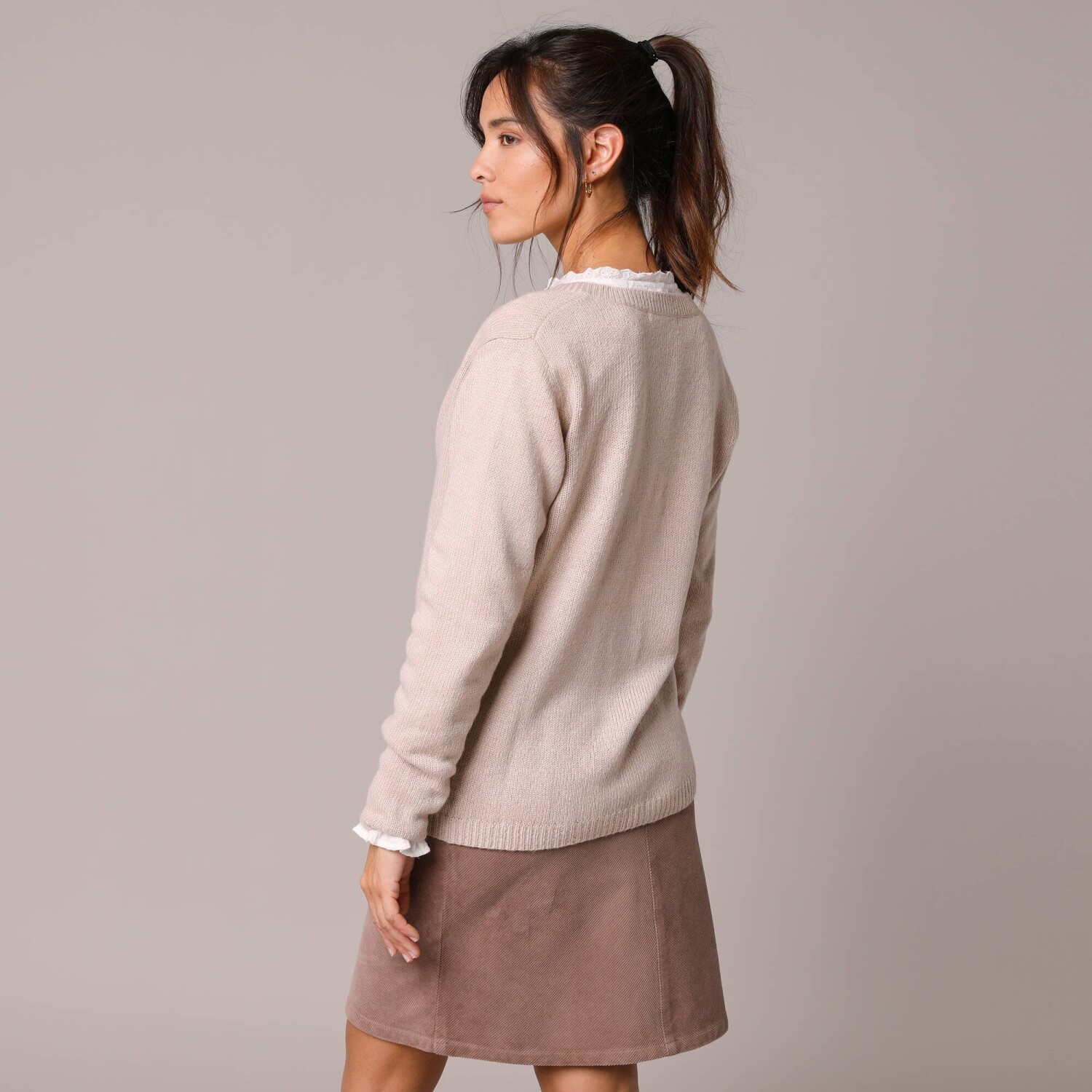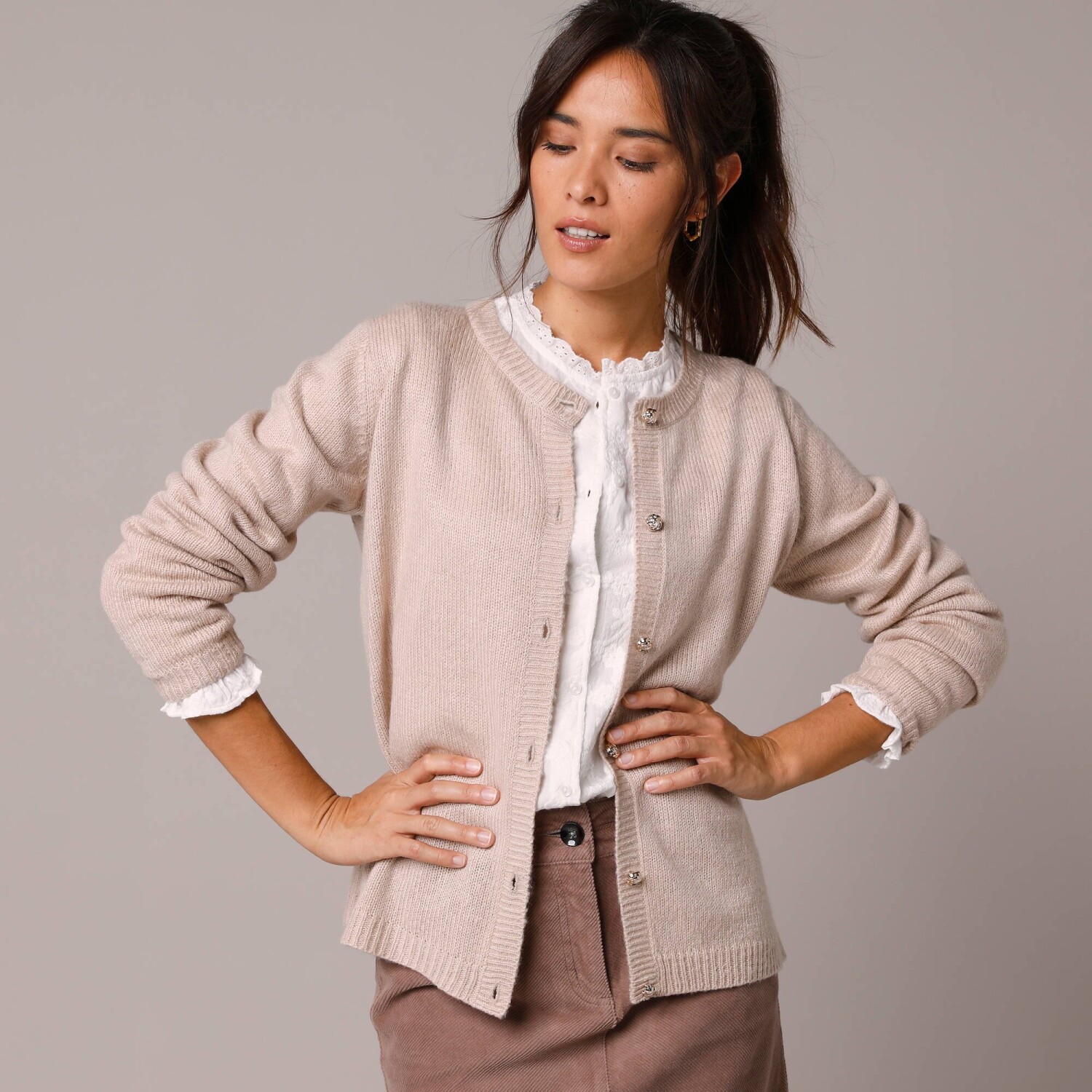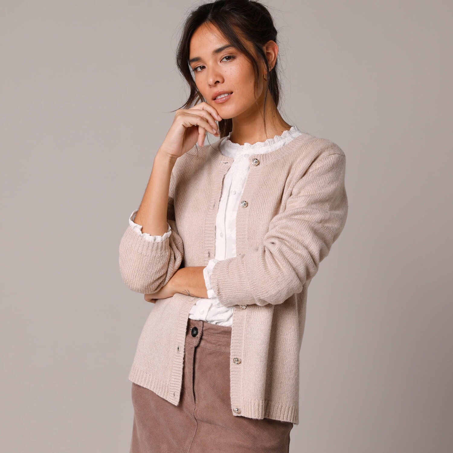 Un cardigan simplu, cu model, care poate fi purtat în straturi și combinat în diverse moduri. Moale la atingere. Decolteu în V. Închidere cu nasturi în față. Fără mâneci. Umeri căzuți. Tiv drept. Se poate spăla la mașină.