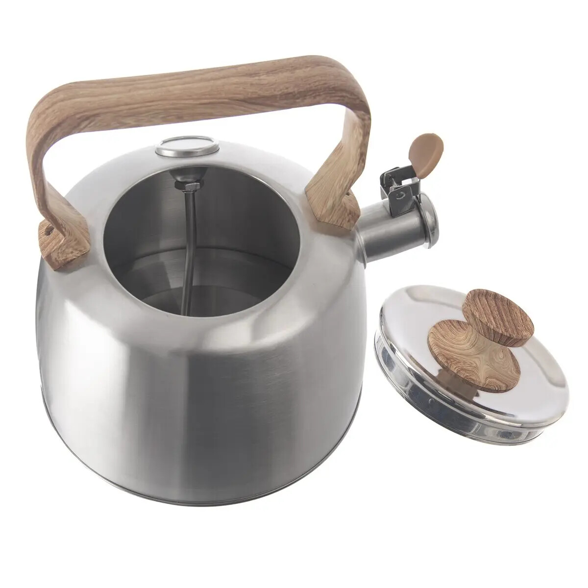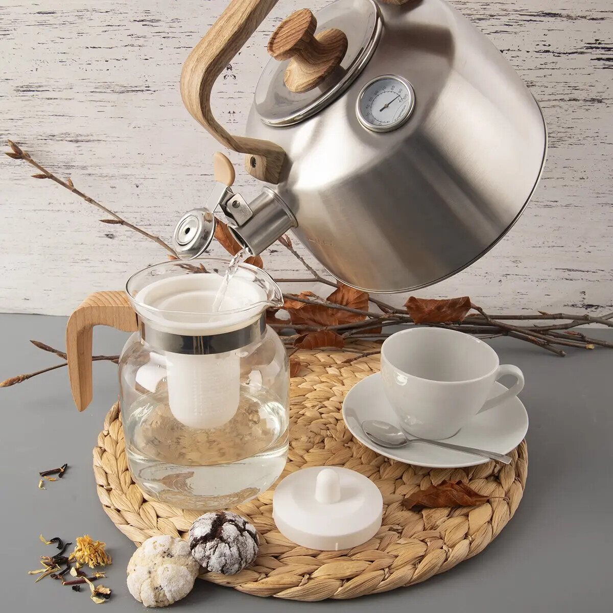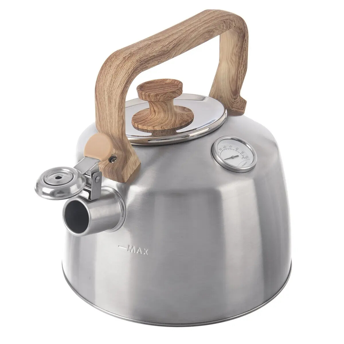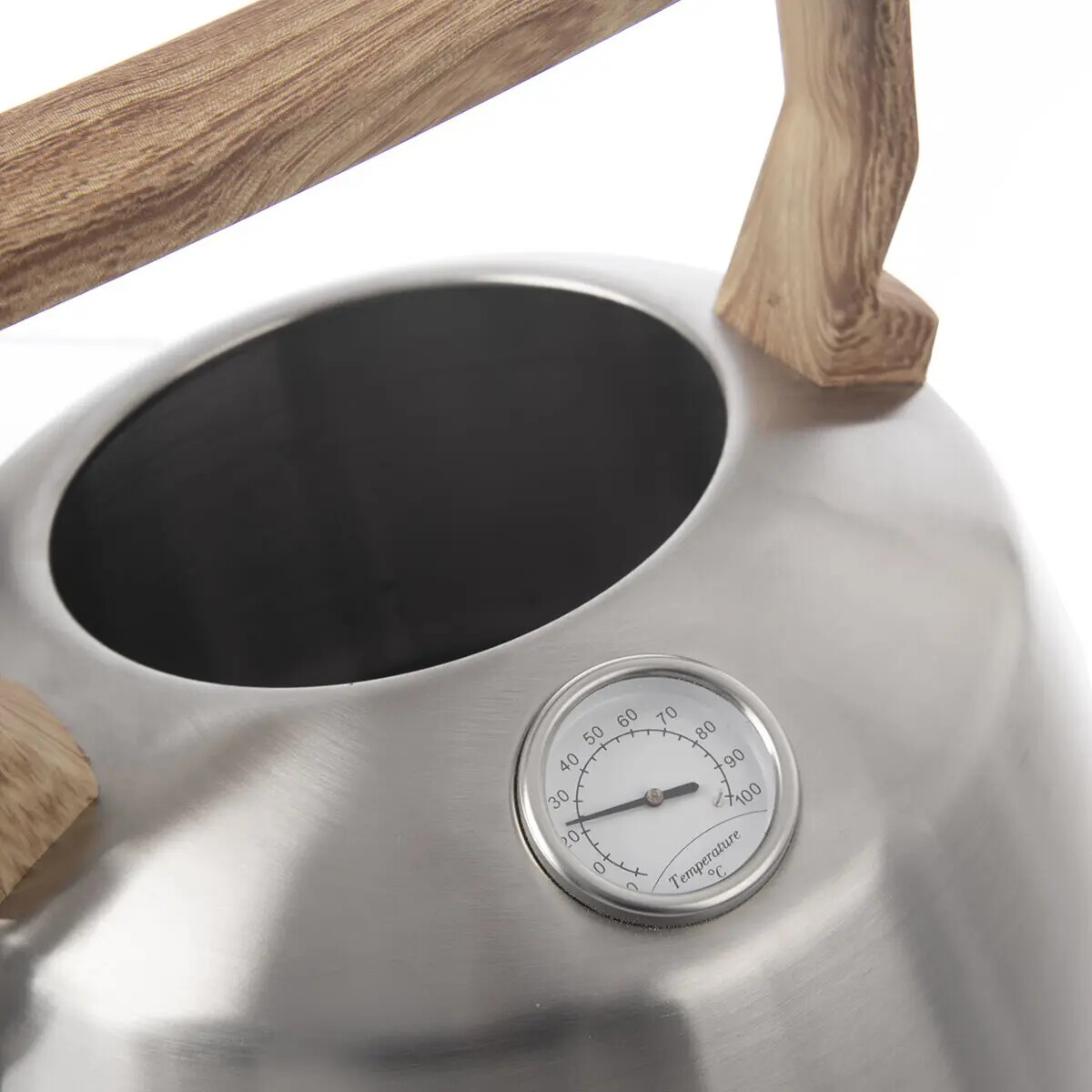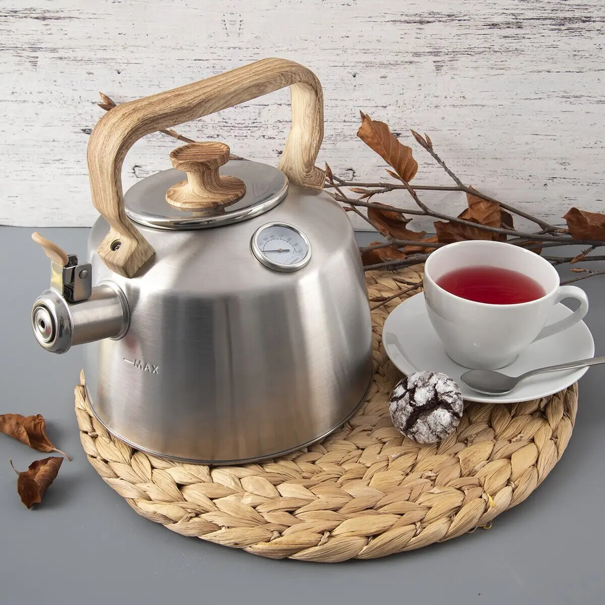 Ceainic de lux cu fluier rabatabil și termometru integrat, realizat din oțel inoxidabil de înaltă calitate, cu un design modern. Mânerul și capacul au decor de lemn. Se potrivește perfect atât în bucătăriile clasice, cât și în cele moderne. Termometrul indică temperatura actuală a apei din ceainic (scară până la 100 °C), fiind foarte util pentru prepararea infuziilor de plante sau a mâncărurilor care necesită o temperatură precisă a apei. Potrivit pentru toate tipurile de plite. Ceainicul trebuie umplut cel puțin până la jumătate pentru a evita supraîncălzirea. Schimbările de culoare ale suprafeței exterioare cauzate de necompletarea minimă nu constituie motiv de reclamație. Nu este potrivit pentru mașina de spălat vase. Material: oțel inoxidabil, plastic (nylon), silicon. Dimensiuni: volum total 3,2 l, volum util 1,9 l (nivel MAX), diametru 20 cm, înălțime 21 cm.