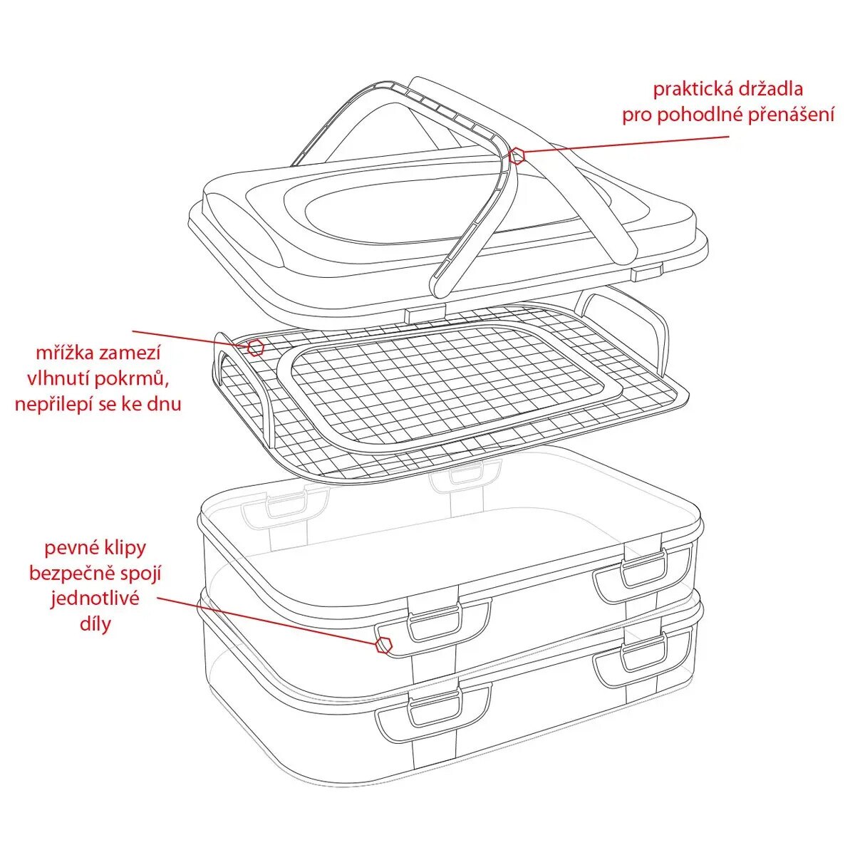 Cutie picnic – 3 niveluri, ideală pentru transportul alimentelor în excursii, la apă, dar și pentru prăjituri, gustări sau dulciuri în timpul pregătirilor pentru o petrecere sau vizită. Setul include 1 grilaj cu mânere pentru a scoate cu ușurință conținutul cutiei. Capac cu două mânere pentru transport confortabil, iar cutiile sunt fixate între ele cu cleme rezistente. Culori variate, fără posibilitatea de alegere. Piese de schimb disponibile în catalog: cutie C009435000, grilaj C009437000, capac C009436000. Material: plastic PP rezistent. Dimensiuni: 40 x 30 x 24 cm.