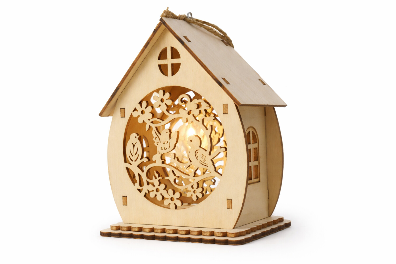 Casuta cu motiv de primavara sculptat. Decoratia poate fi pur si simplu agatata in fereastra, pe perete sau pusa pe pervaz sau pe raft. LED-urile incorporate sunt foarte economice si durata de iluminare indelungata. Alimentare cu 2 × LR44, care nu sunt parte a livrarii.