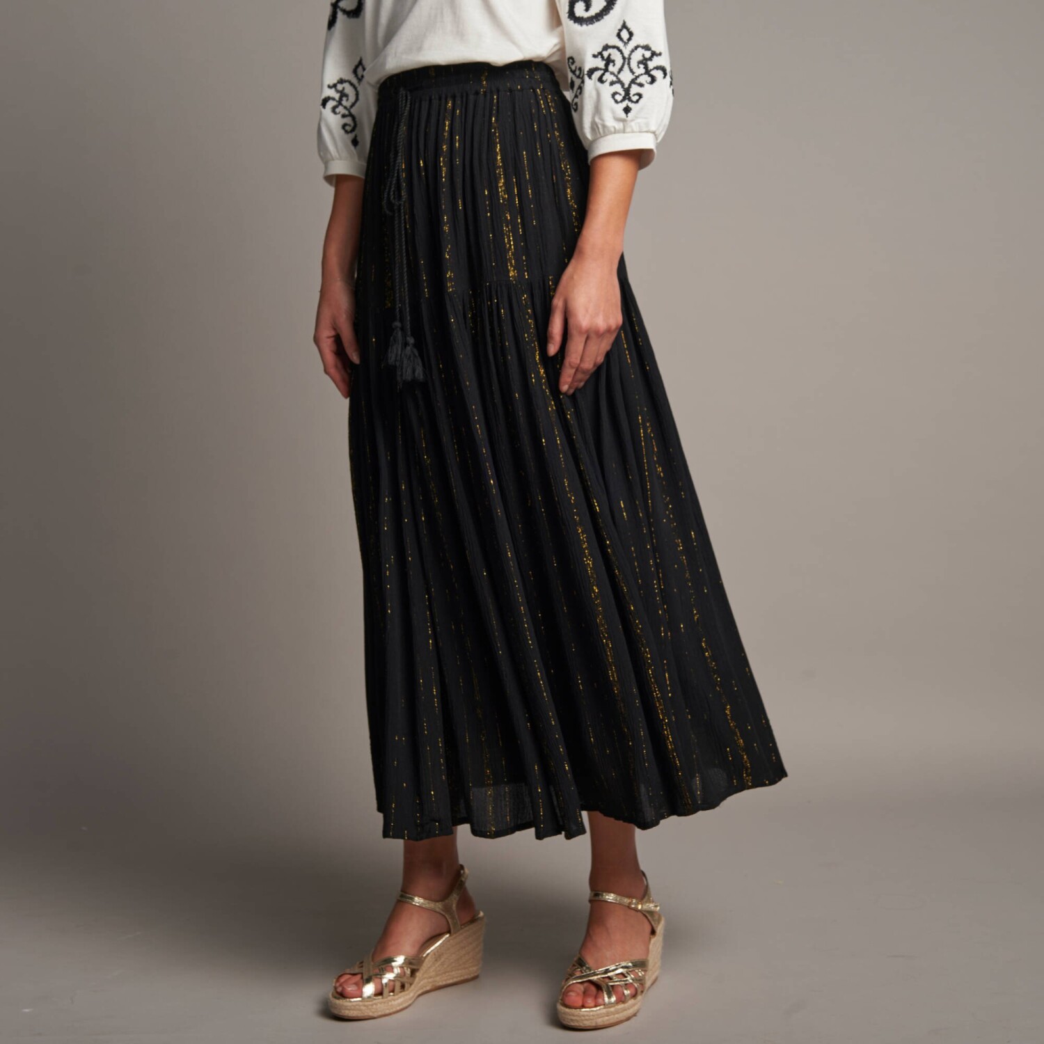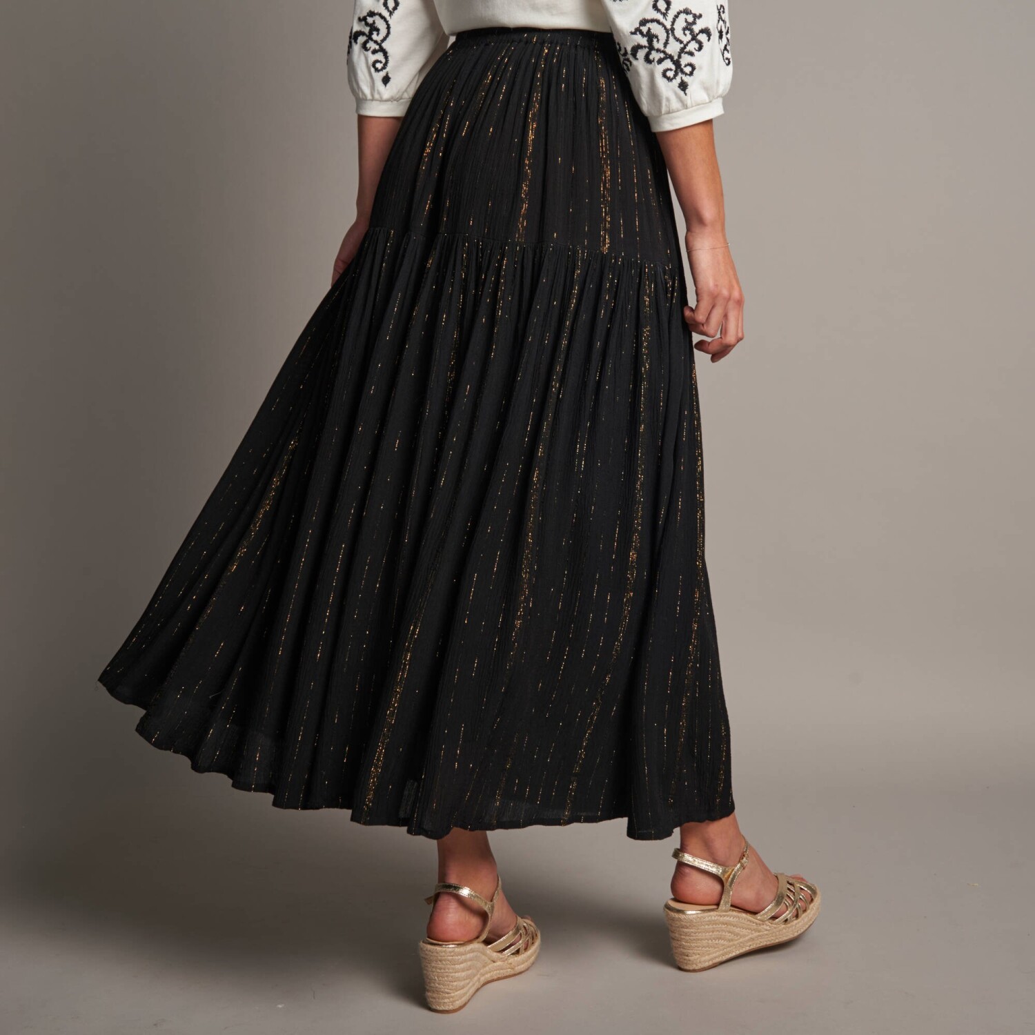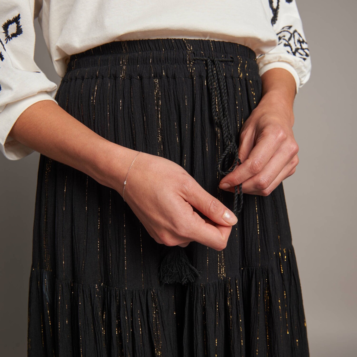 Lungime până la genunchi și croială seducătoare, fusta midi este un articol vestimentar atemporal! Moale la atingere, ușor elastică, confortabilă de purtat. Cu o lungime concepută pentru o siluetă sub 160 cm. Talie modelată cu gaici în față și în spate. Șliț în față. Fermoar frontal + 1 nasture. 2 buzunare aplicate în față. 2 buzunare false cu paspoal în spate. Pense la spate. Tiv ușor evazat. Certificat Made In Green de către OEKO-TEX®. Pe lângă verificarea a câteva sute de substanțe chimice care contribuie la o siguranță ridicată, această etichetă garantează principii de producție atente și practici sociale controlate. Se poate spăla la mașină.