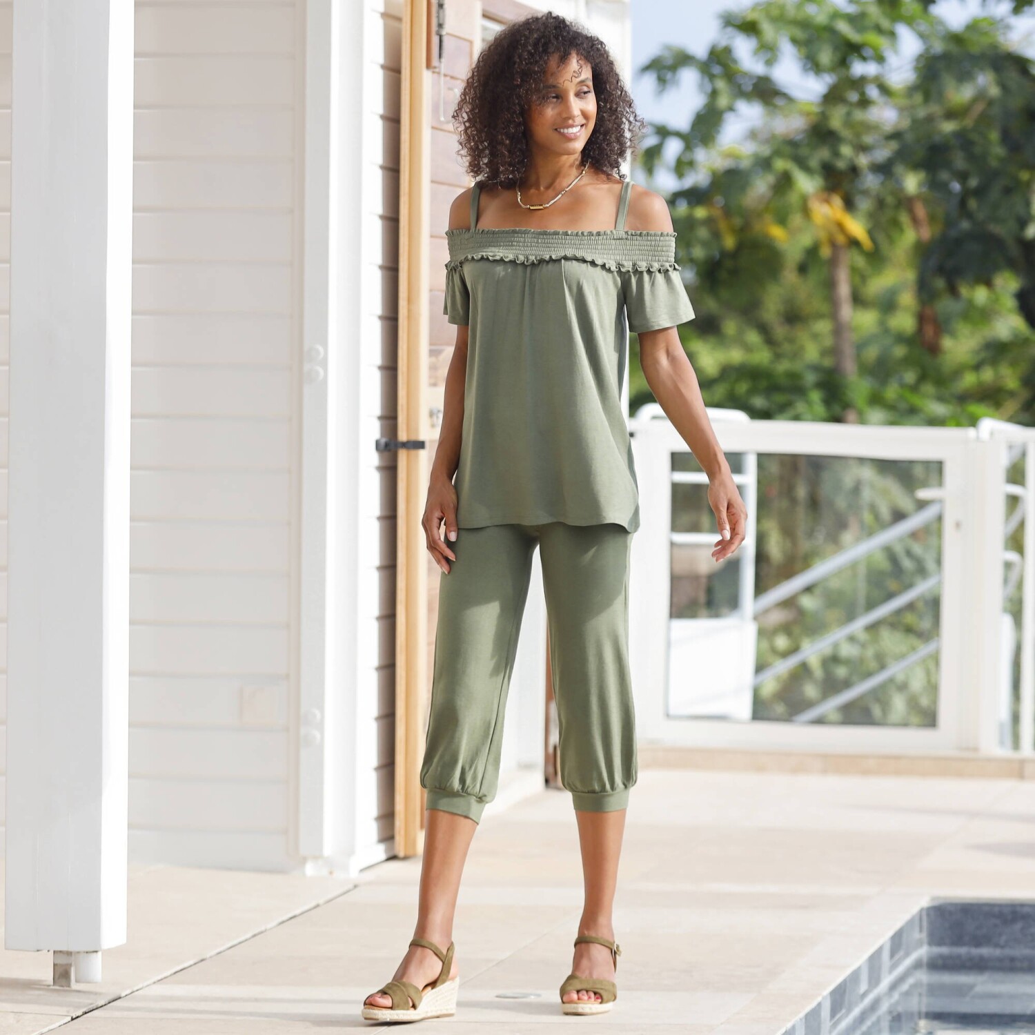 Pantalonii 3/4 pot fi ușor combinați cu o bluză sau un top asortat pentru a crea un efect de salopetă. Croială actuală și la modă. Talie elastică lată și plată pentru un stomac plat. Capetele picioarelor cu inserții și încrețituri. Tricot elastic pentru libertate de mișcare. Standard 100 conform Oeko-Tex (n° CQ 1216 / 3 IFTH). Această marcă identifică produsele textile care au fost supuse unor teste de laborator pentru o gamă largă de substanțe nocive și produsul este sigur dincolo de standardele actuale. Se poate spăla la mașină.
