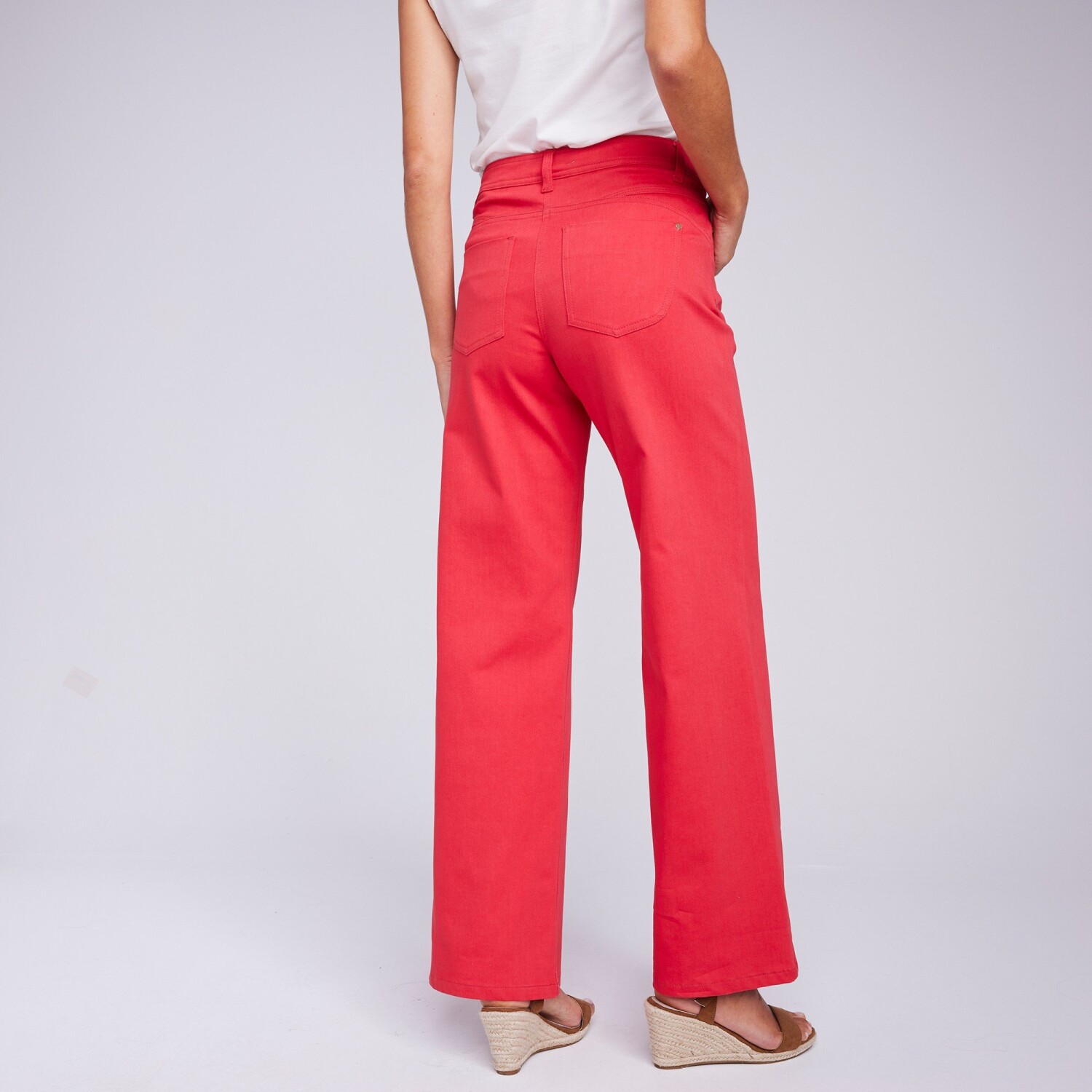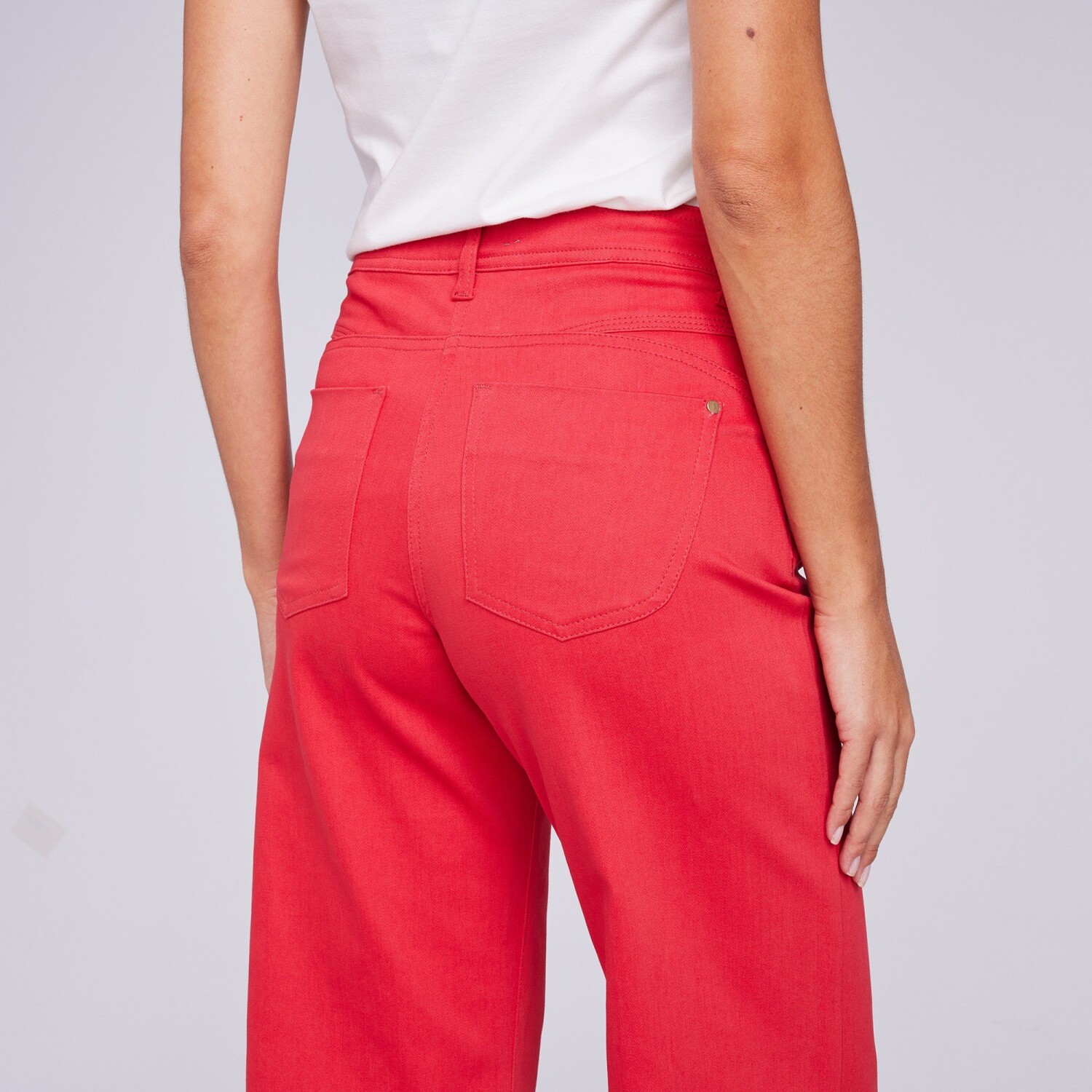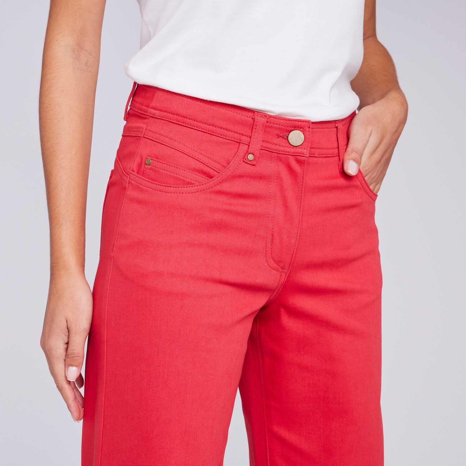Pantalonii slim 7/8 de culoare solidă alungesc vizual silueta. Talie înaltă. Croială țigaretă: dreaptă la nivelul coapselor, strânsă la nivelul gleznelor. Lungimea de 7/8 alungește silueta. Talie plată în față, elastic la spate. Închidere cu fermoar, cârlig și buton interior. 2 buzunare cu pliu în față. 2 buzunare aplicate în spate. 2 buzunare false în spate. Fante la capetele picioarelor. Nasturi. Se poate spăla la mașină.