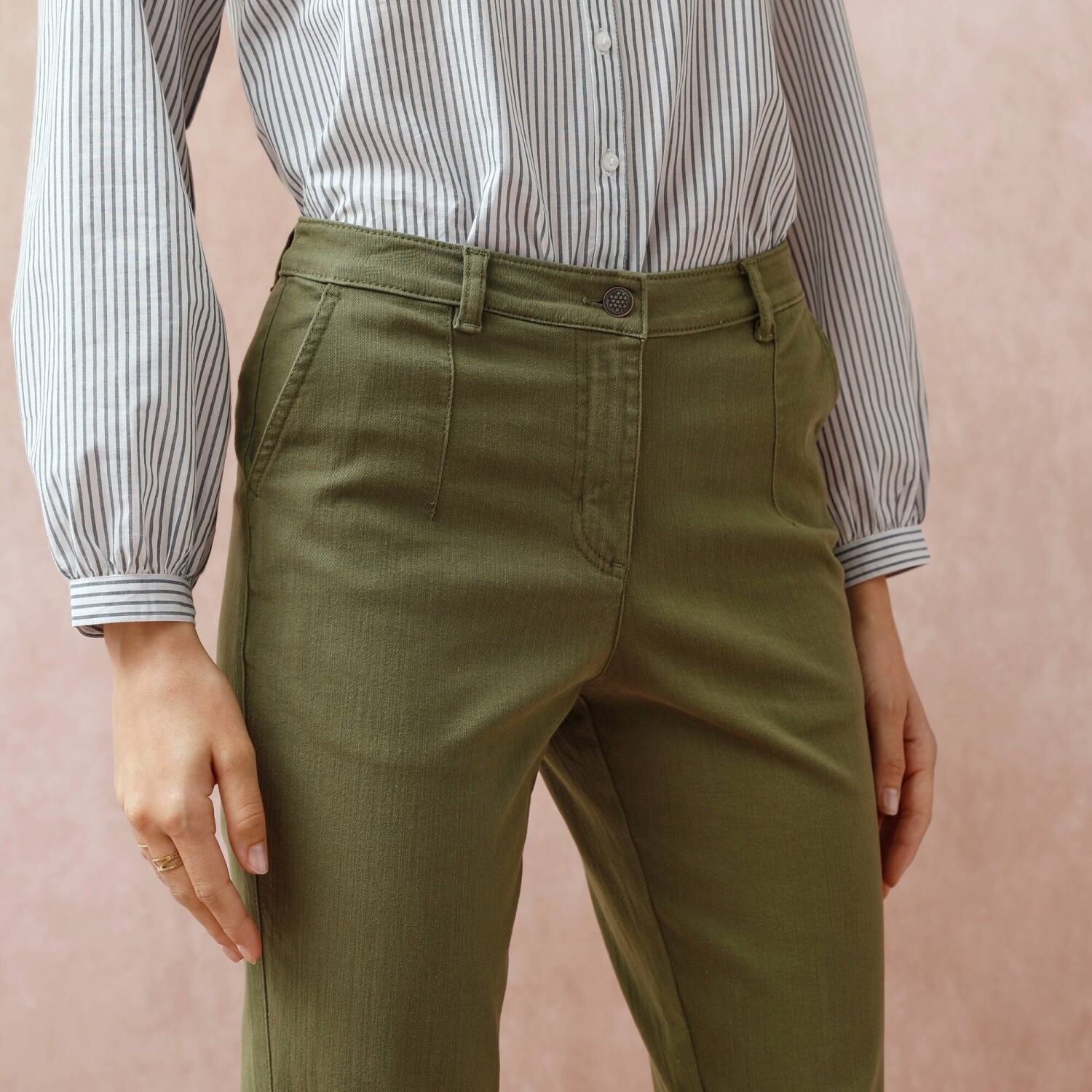 Pantaloni foarte la modă, cu croială chino elastică, care pot fi suflecați după nevoie. Pantalonii au talie standard. Talia are găici pentru curea și laterale elastice de la mărimea 44. Închidere cu fermoar și nasturi. Două buzunare frontale cu clapă. Două pense la spate și două buzunare cu refilet și nasturi. Standard 100 conform Oeko-Tex (CQ 1216/3 IFTH). Această marcă indică faptul că produsele textile au fost testate în laborator pentru o gamă largă de substanțe nocive, iar produsul este sigur pentru utilizare dincolo de standardele aplicabile. Se poate spăla la mașină.