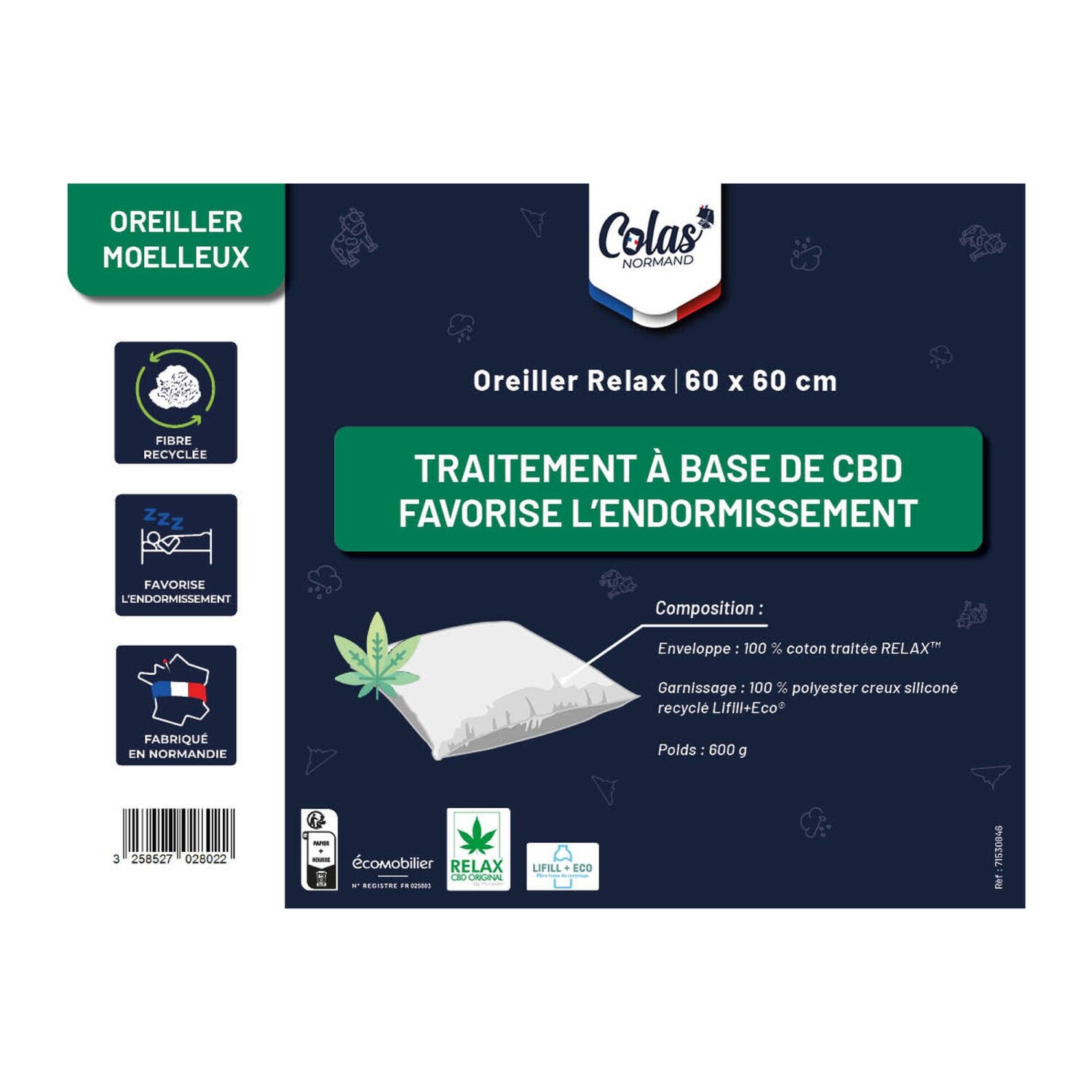Perna moale Colas Normand este concepută pentru un suport optim al capului și gâtului și folosește puterile relaxante ale cânepei. O modalitate foarte blândă de a vă ajuta să vă relaxați și să adormiți mai ușor. Calitatea umpluturii permite o distribuție uniformă a fibrelor în interiorul pernei. Fibrele tubulare siliconate asigură o pufosețe și o izolație optime. Fabricată din bumbac plăcut la atingere, o husă fermă pentru respirabilitate maximă și durată lungă de viață. Tratament Relax CBD™ Technology pe bază de cânepă, care facilitează adormirea și aduce un somn de calitate. Ingredient activ din cânepă cu efecte benefice. O pernă potrivită pentru persoanele care preferă să doarmă pe spate. Blancheporte a ales poliester reciclat, contribuind astfel la lupta împotriva deșeurilor și promovând un consum mai responsabil, care respectă mediul. Fabricată în Franța. Se spală la 40°C, se usucă la aer.