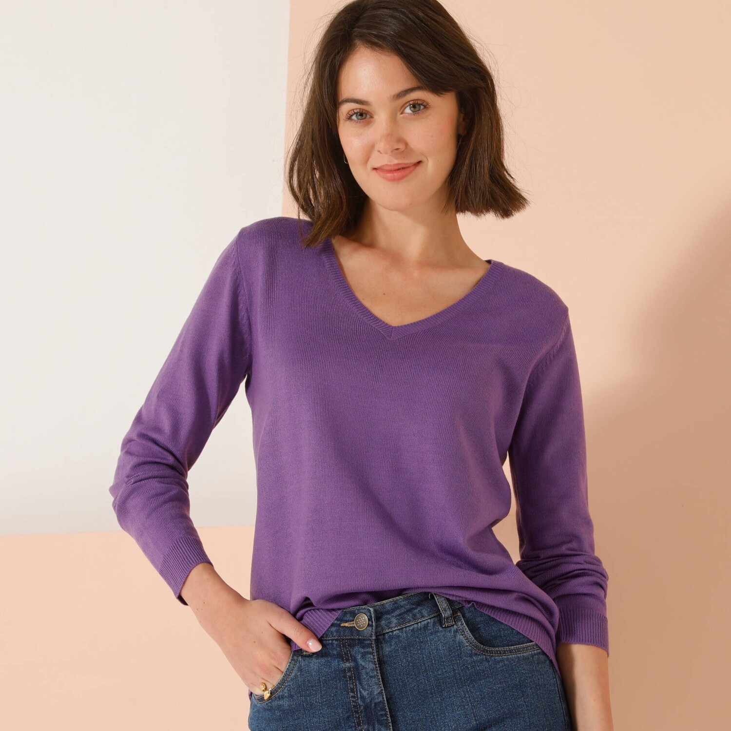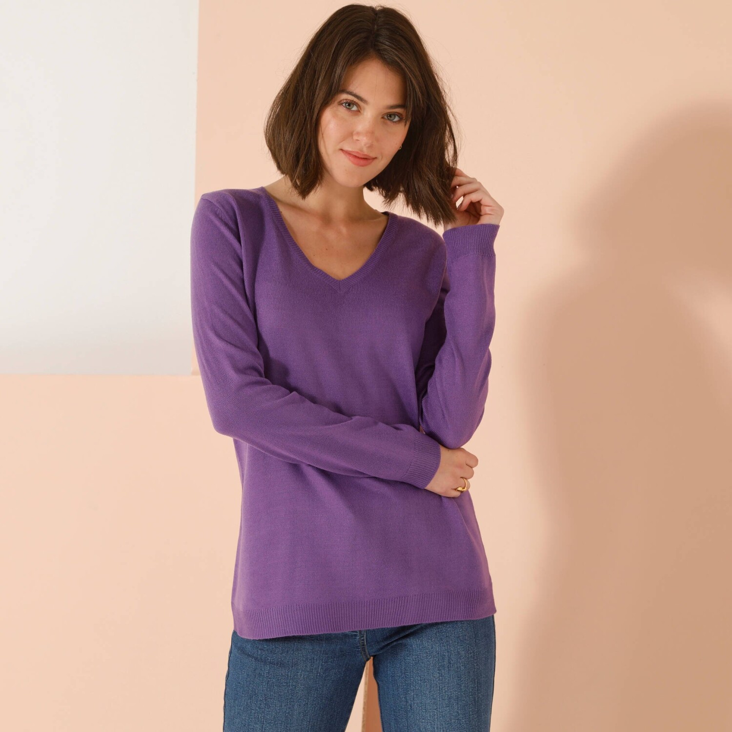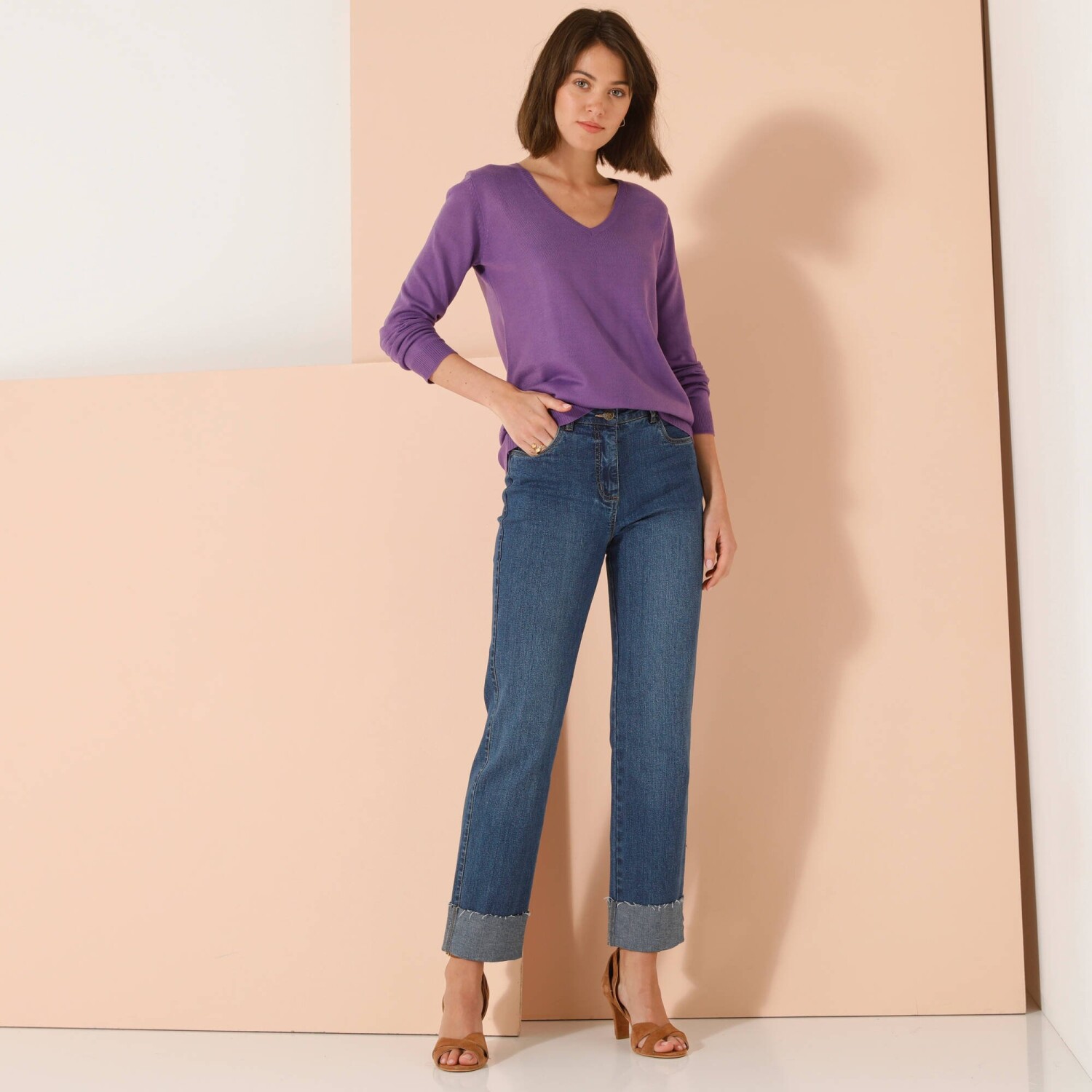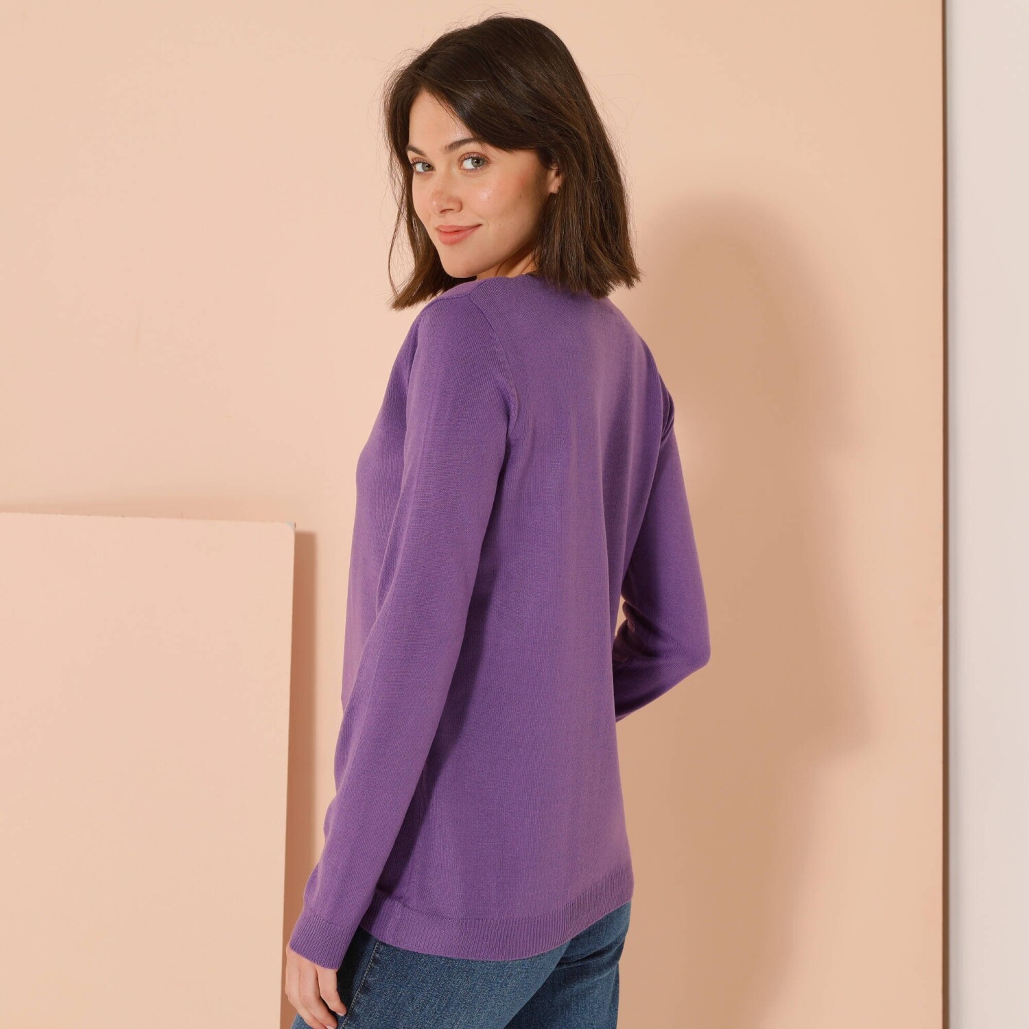 Visezi la un pulover călduros și la modă? Îl avem pentru tine! Prezintă un decolteu rotund și lejer. Manșete și partea centrală în față cu nervuri. Umeri căzuți. Nasturi imitație pe umeri. Tiv drept. Șliț lateral. Se poate spăla la mașină.