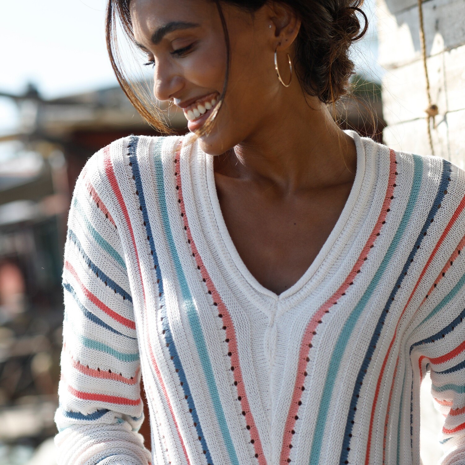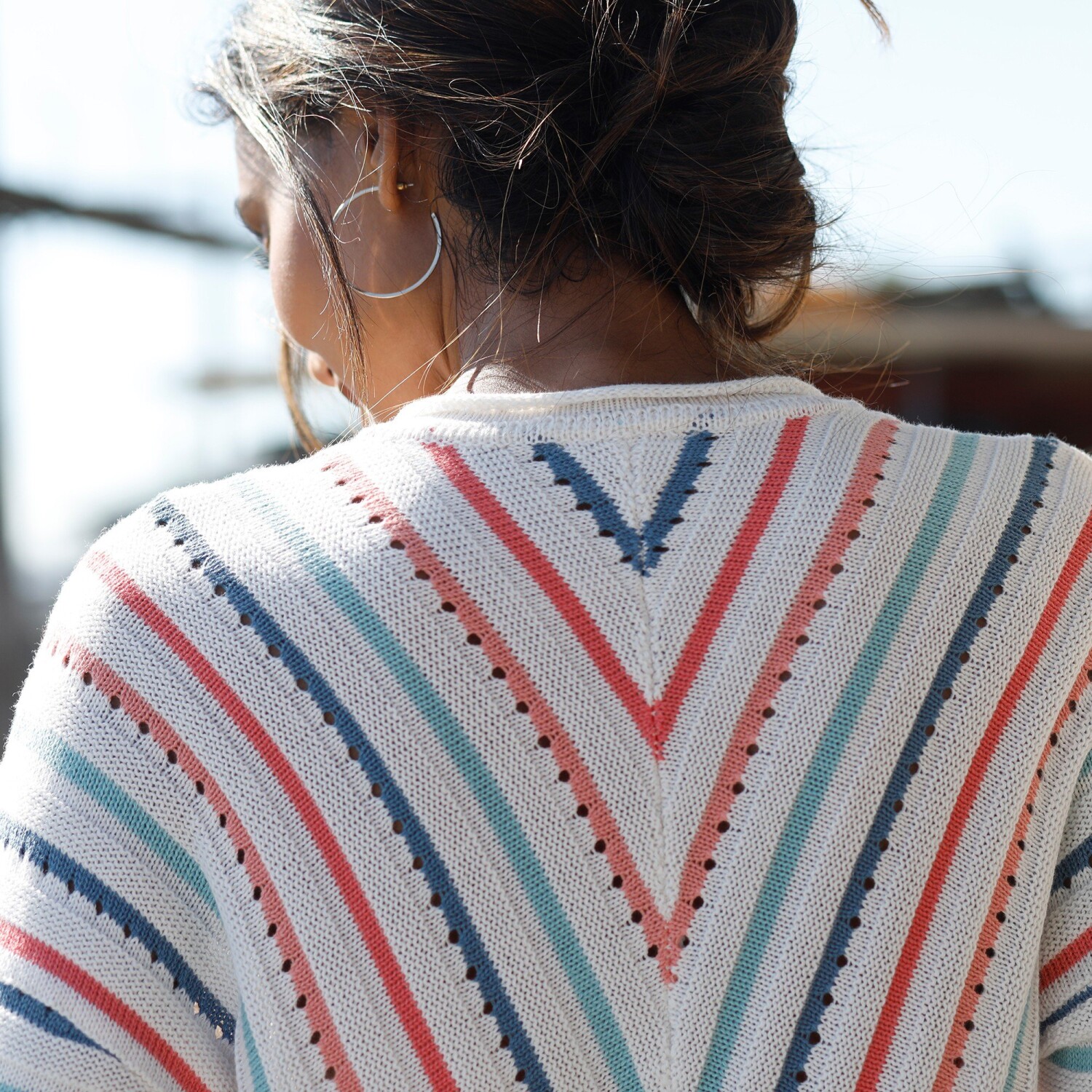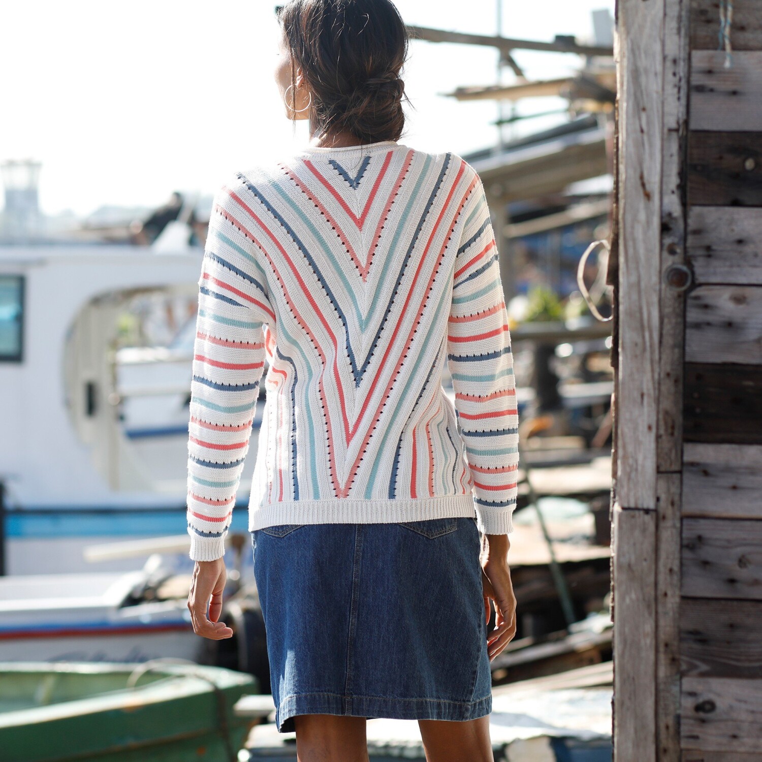 Puloverul cu guler tunisian este irezistibil. Confecționat dintr-un material moale, tricotat simplu, are o croială simplă și confortabilă. Are guler tunisian. Se închide cu nasturi din sidef. Are mâneci lungi și tiv drept. Se poate spăla la mașină.