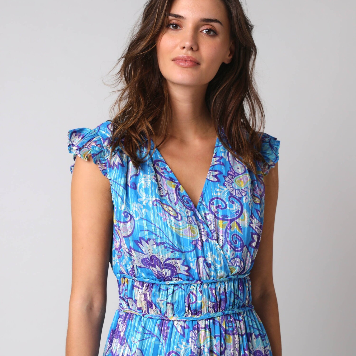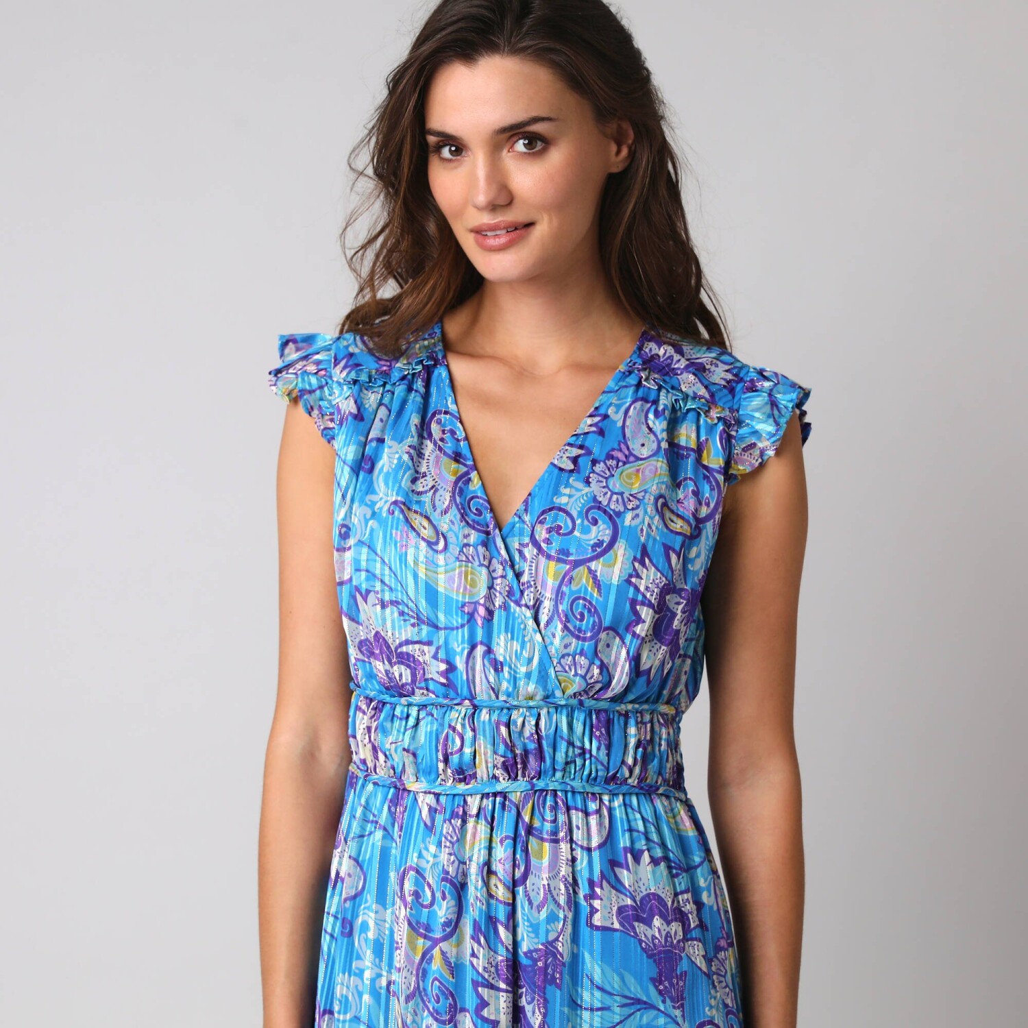 Iconică și irezistibilă, această rochie lungă din crepe și macramé iese în evidență prin caracteristicile sale unice. Lungime maxi. Decolteu în V cu macramé. Mâneci scurte cu volane. Croială sub bust, pliuri cusute în față, pliuri în spate. Se încrețește sub bust și în talie în față și în spate. Tiv inferior lărgit cu volan lat și încrețit. Se poate spăla la mașină.