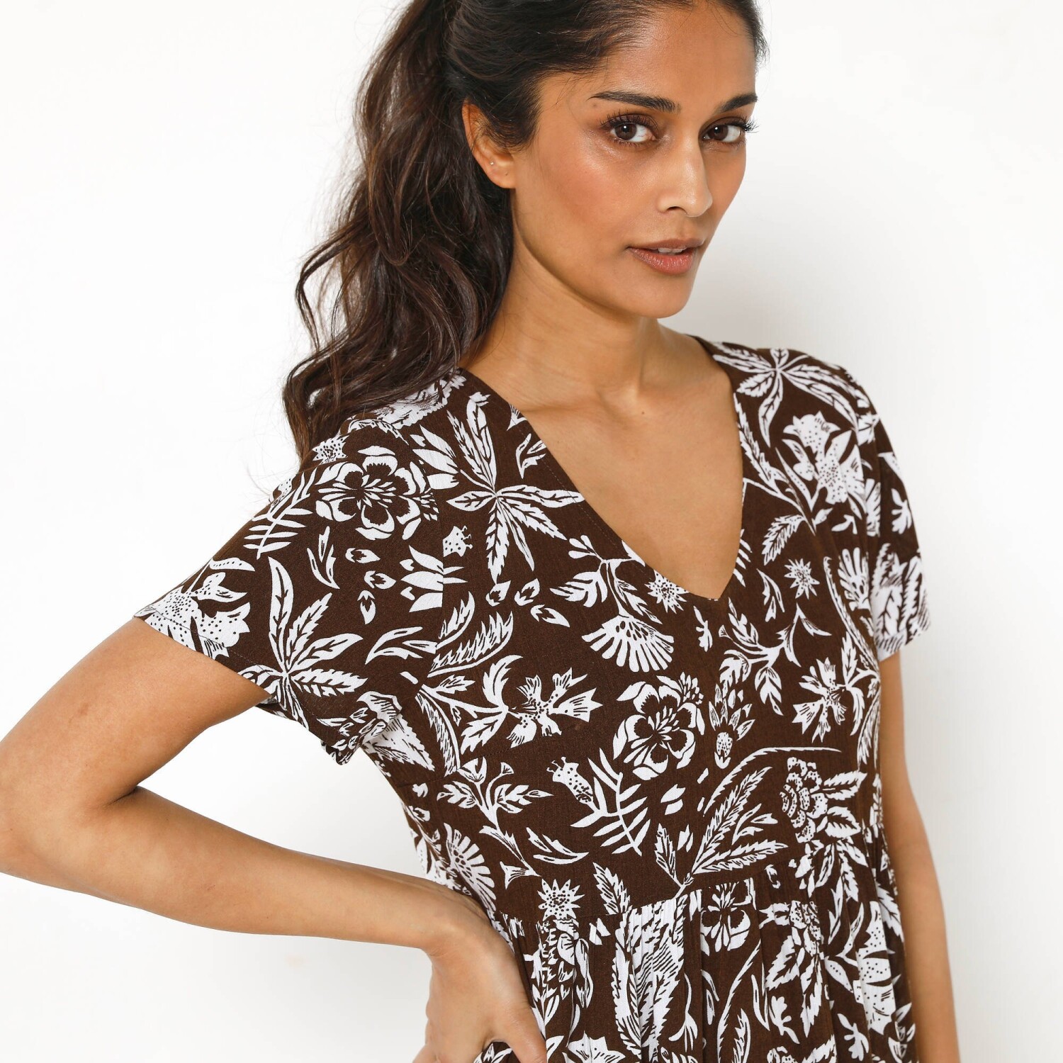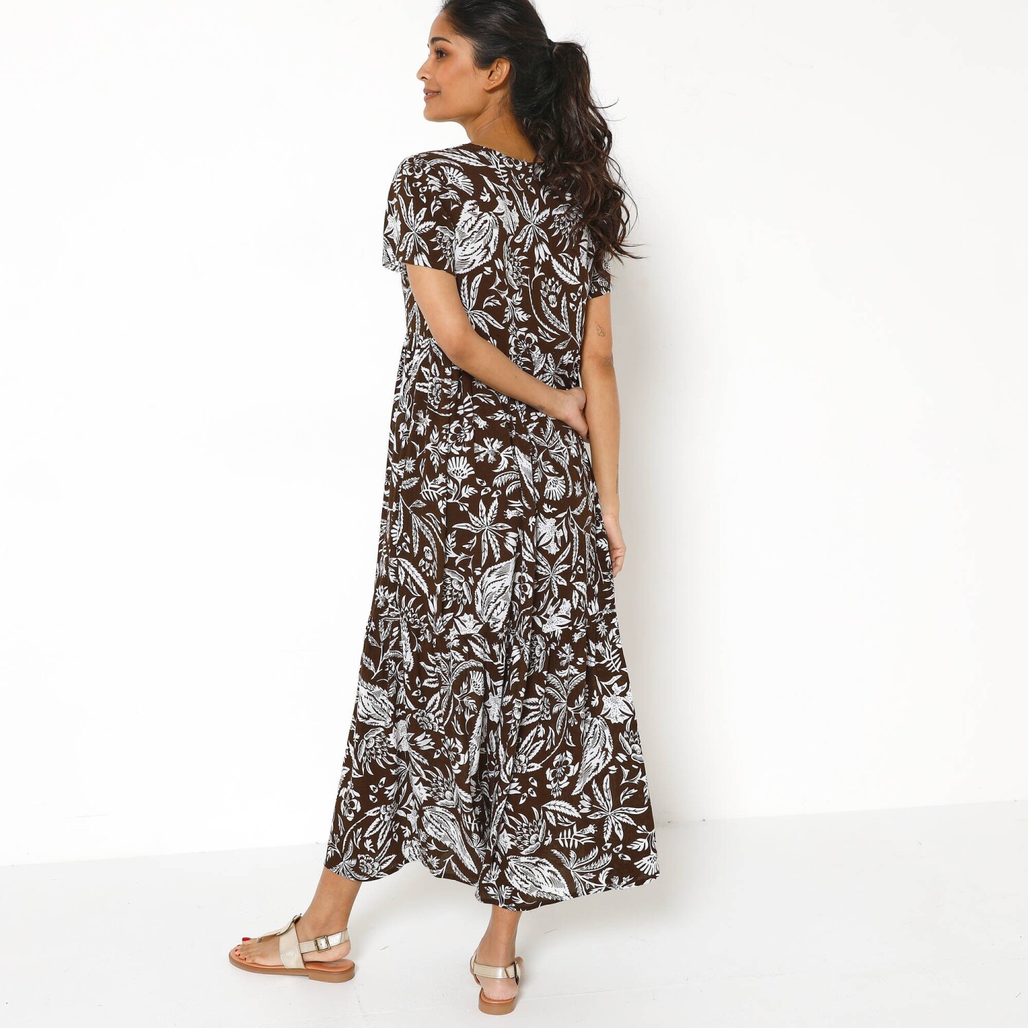 O rochie imprimată care știe cum să atragă toate privirile! Confecționată din crepon ușor. Lungime până la gleznă. Decolteu în V și deschidere cu nasturi. Talie plată în față, elastică în spate. Se încrețește deasupra și dedesubtul inserției din talie. Mâneci scurte elastice cu șnururi rezistente pentru legare. Se încrețește la umeri. Fentă laterală. Tiv inferior lărgit. Se poate spăla la mașină.
