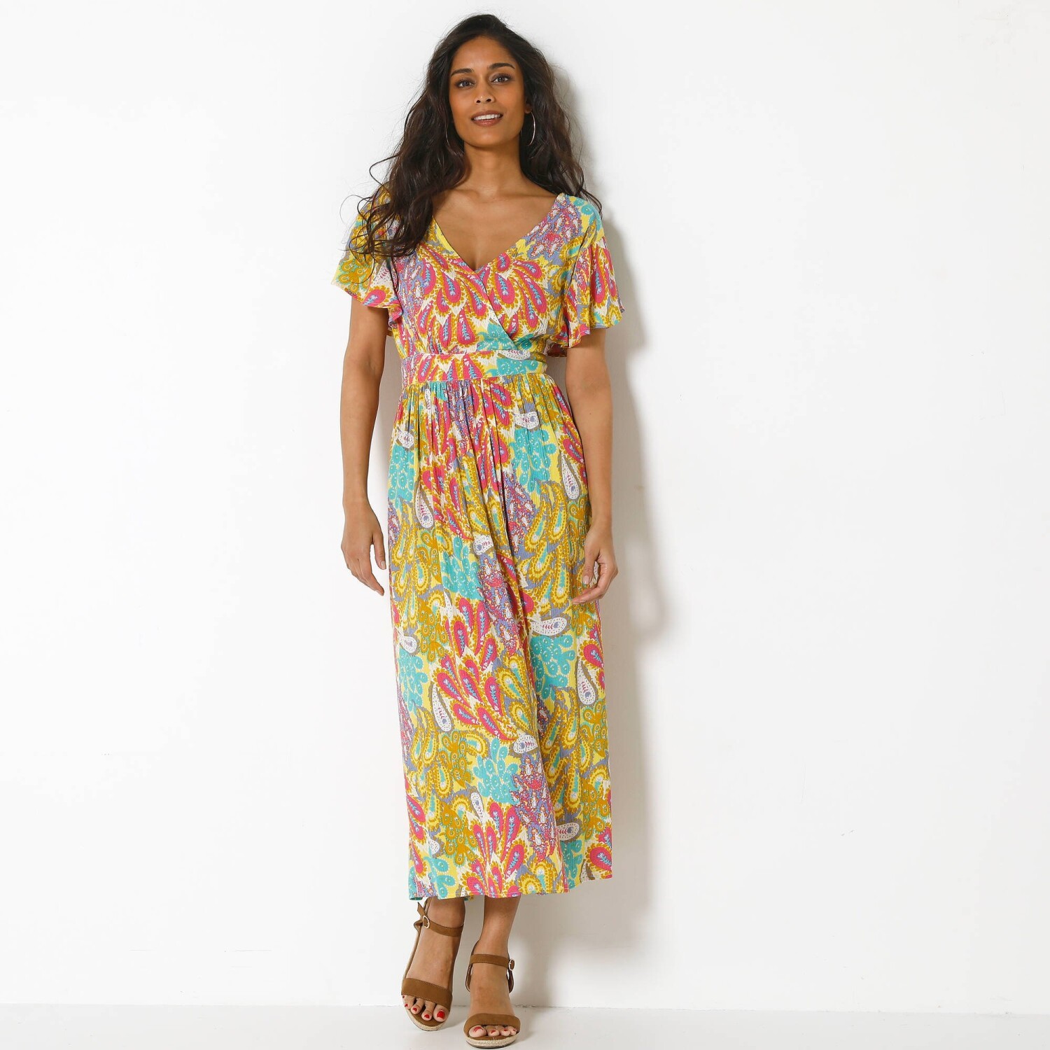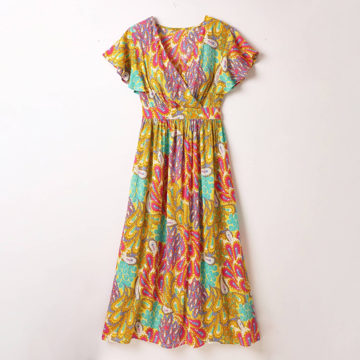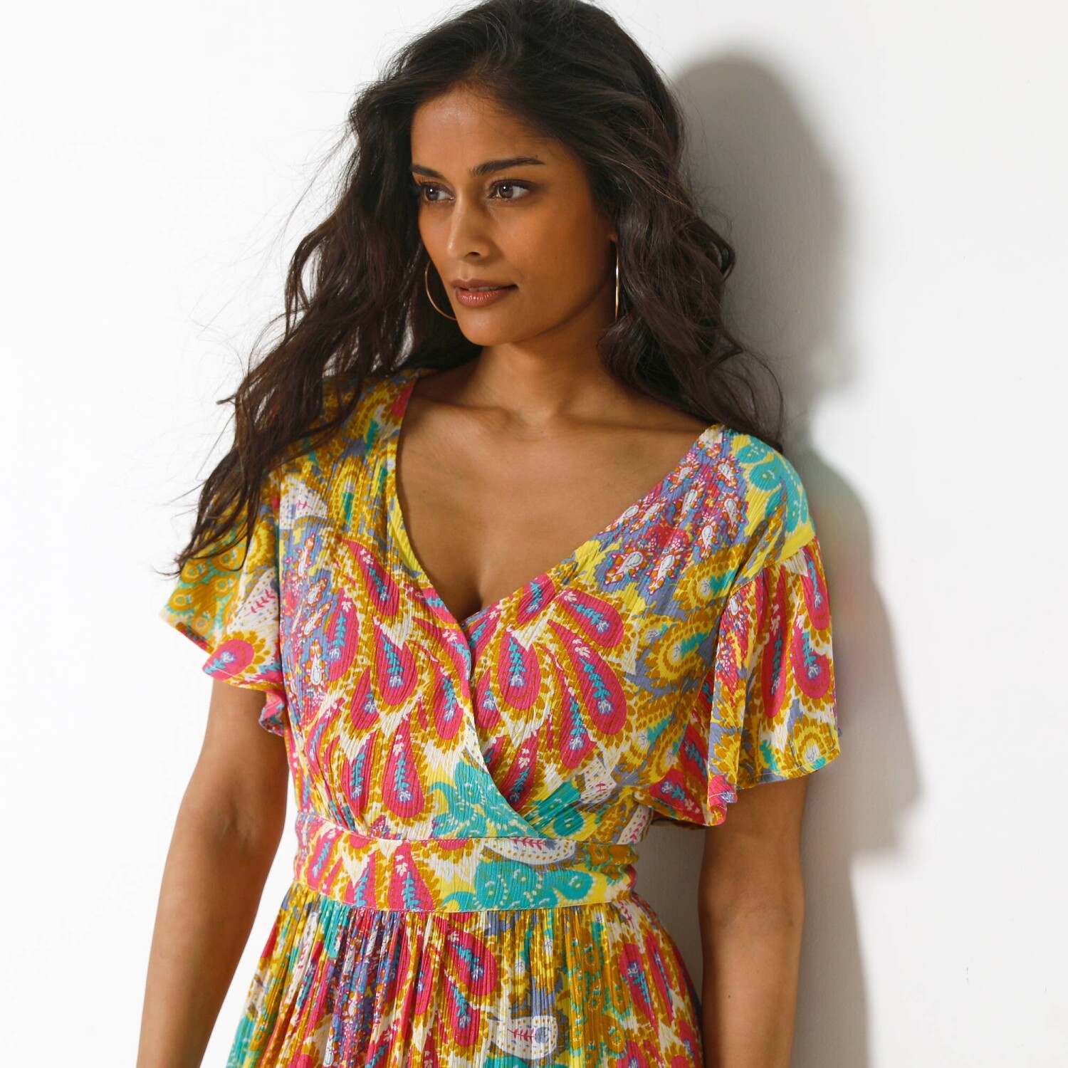 Rochie midi cu imprimeu original colorat, una dintre piesele preferate de vară! Decolteu în V. Rochie midi cu mâneci scurte și imprimeu cu șliț cu nasturi. Mâneci scurte. Umeri căzuți. Șnururi pe umeri cu ciucuri, reglabile. Șnure laterale pentru legat la spate pentru un efect mulat. Fante laterale adânci. Tiv inferior lărgit. Confecționată din viscoză vaporoasă. Se poate spăla la mașină.