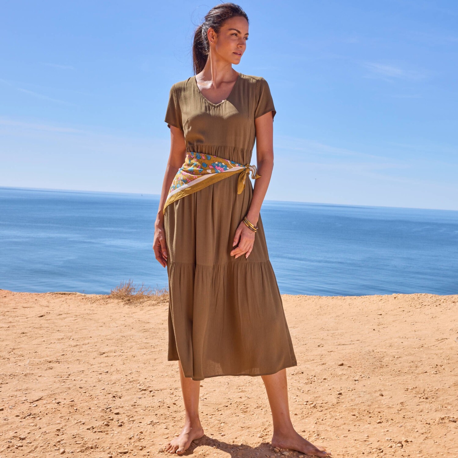 O rochie imprimată care știe cum să atragă toate privirile! Confecționată din crepon ușor. Lungime până la gleznă. Decolteu în V și deschidere cu nasturi. Talie plată în față, elastică în spate. Se încrețește deasupra și dedesubtul inserției din talie. Mâneci scurte elastice cu șnururi rezistente pentru legare. Se încrețește la umeri. Fentă laterală. Tiv inferior lărgit. Se poate spăla la mașină.
