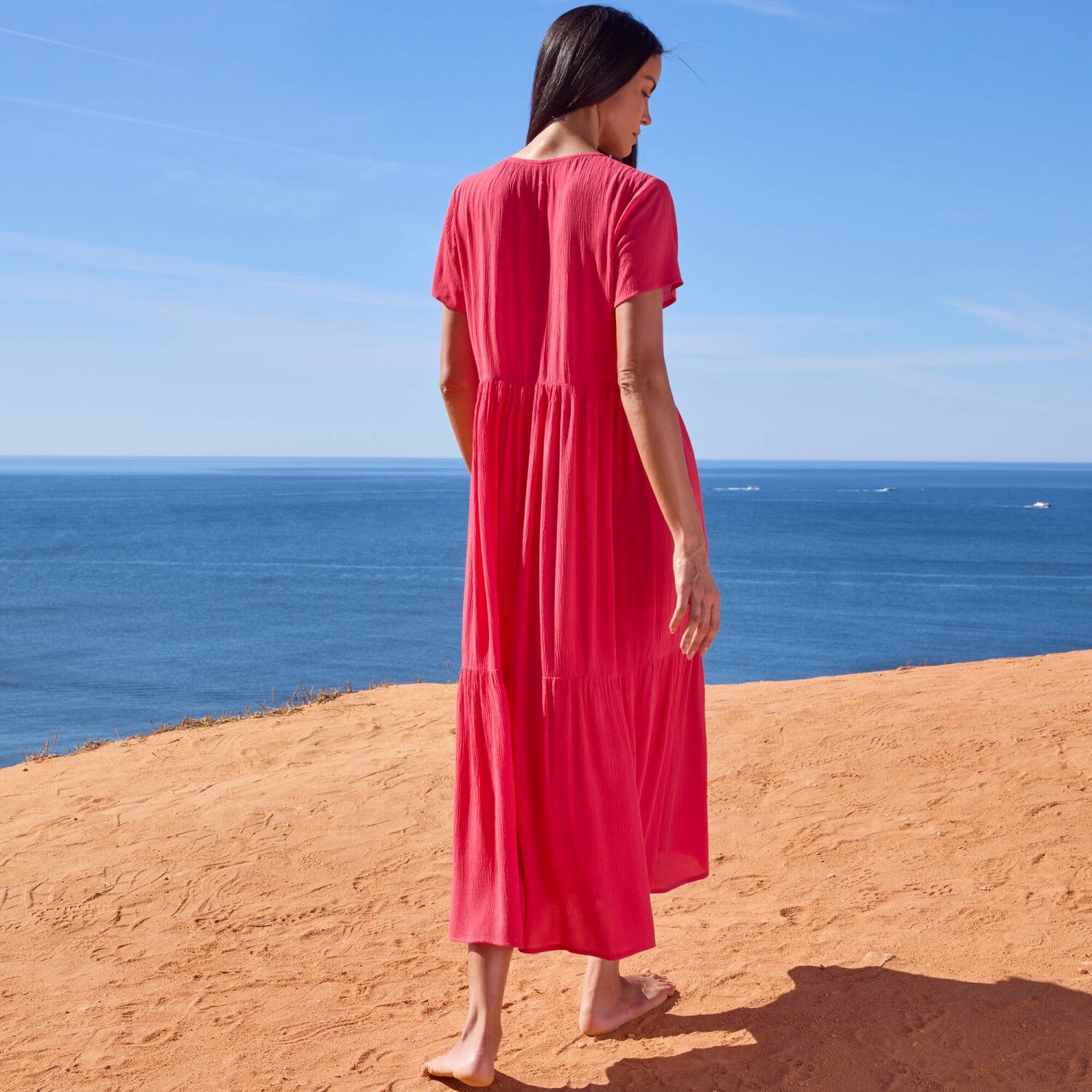 Rochia confecționată din crepe ușor va oferi un look glamour. Datorită croiului evazat, se potrivește oricărei siluete. Crepe ușor și proaspăt. Croi evazat. Decolteu în V. Mâneci scurte. Pense la piept. Croială cu talie înaltă. Partea de jos a rochiei este cu volane. Se poate spăla la mașină.