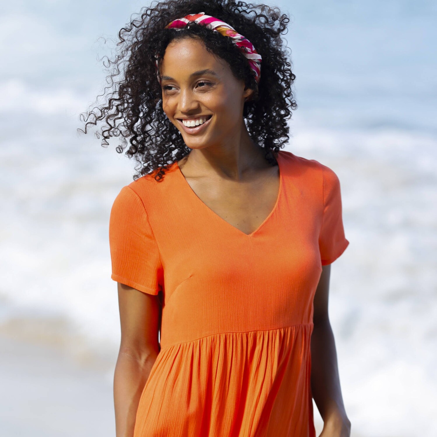 O rochie din crep ușor va avea grijă de aspectul glamour. Datorită croielii evazate, se potrivește fiecărei siluete. Crepon ușor proaspăt. Croială extinsă. Decolteu în V. Mâneci scurte. Darduri la nivelul pieptului. Croială cu talie înaltă. Partea de jos a rochiei cu volane. Se poate spăla la mașină.