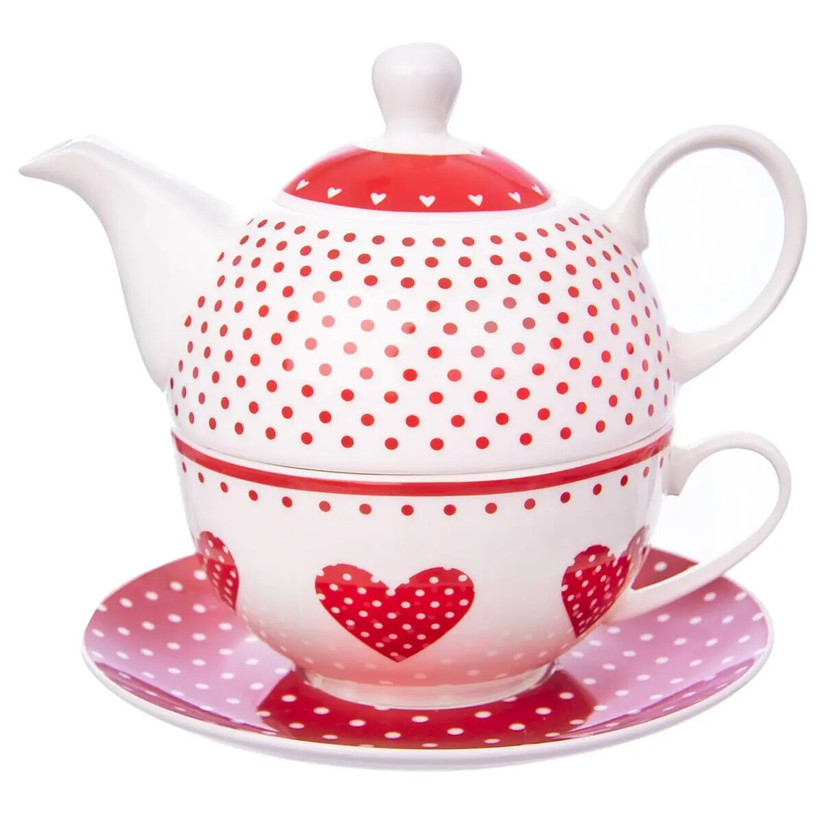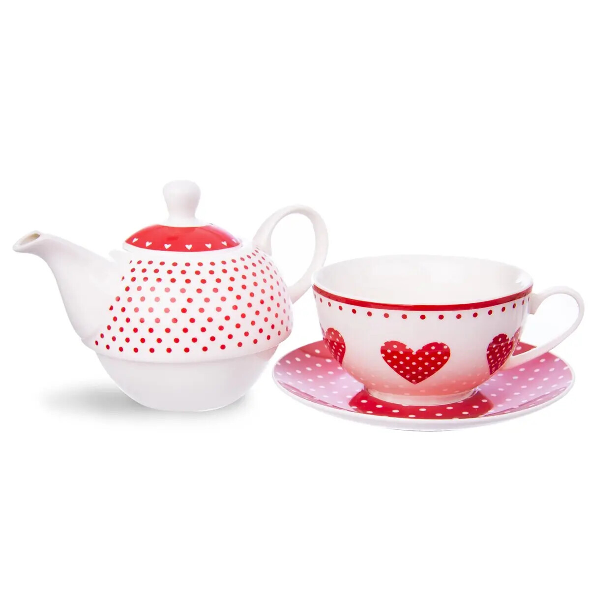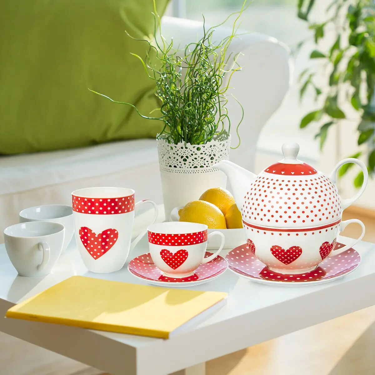 Pentru iubitorii de ceai, oferim acest adorabil set de ceai. Este realizat din porțelan și constă dintr-un ceainic de 540 ml cu capac, o cană mai mare de 490 ml și o farfurioară asortată. Întregul set este decorat cu puncte și inimioare roșii, care atrag atenția prin veselia și culoarea lor. Setul este potrivit pentru spălarea în mașina de spălat vase și utilizarea în cuptorul cu microunde. Material: porțelan. Dimensiuni: înălțime totală 14 cm, cană – diametru 11 cm, înălțime 5,7 cm, volum 0,34 l, ceainic – diametru 11 cm, înălțime 10 cm, volum 0,38 l.