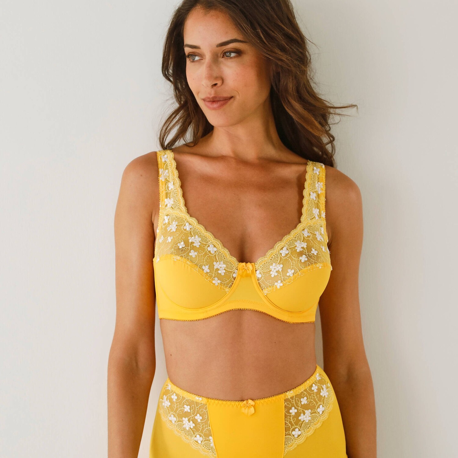 Acest sutien cu arcuri vă va oferi un confort deosebit. Partea superioară a cupei, șezutul dintre cupe, șoldurile și bretelele din față sunt realizate din dantelă. Partea inferioară a cupei în 3 bucăți, realizată din căptușeală din tricot satinat. Spatele este realizat din tricot de satin elastic. Arcul plat între cupe. Curele elastice și reglabile la spate, bandă inferioară mai largă de la mărimea 80D. Standard 100 conform Oeko-Tex (n° CQ 1216 / 3 IFTH). Această marcă identifică produsele textile care au fost supuse unor teste de laborator pentru o gamă largă de substanțe nocive, iar produsul este sigur dincolo de standardele actuale. Se poate spăla la mașină.