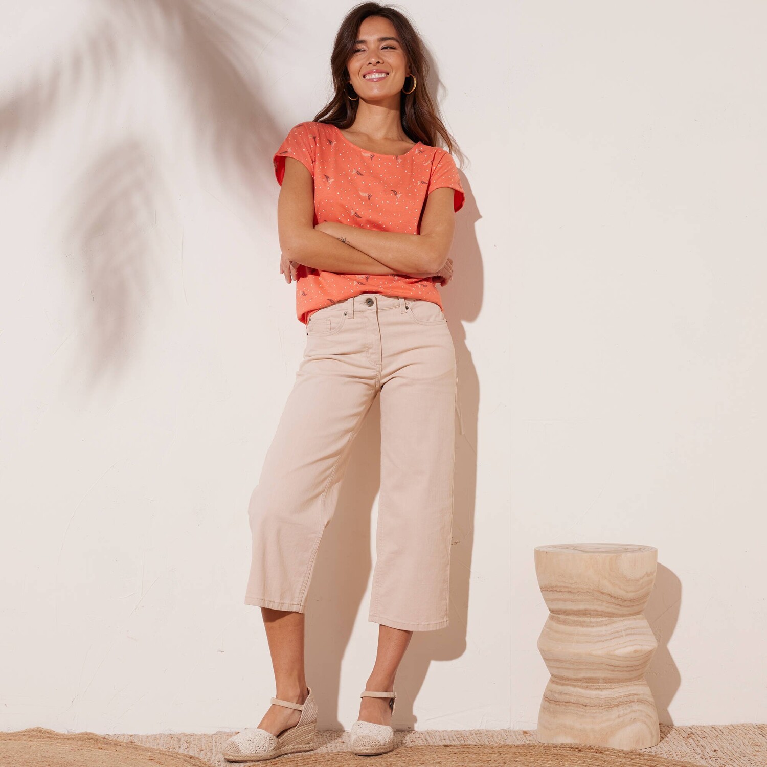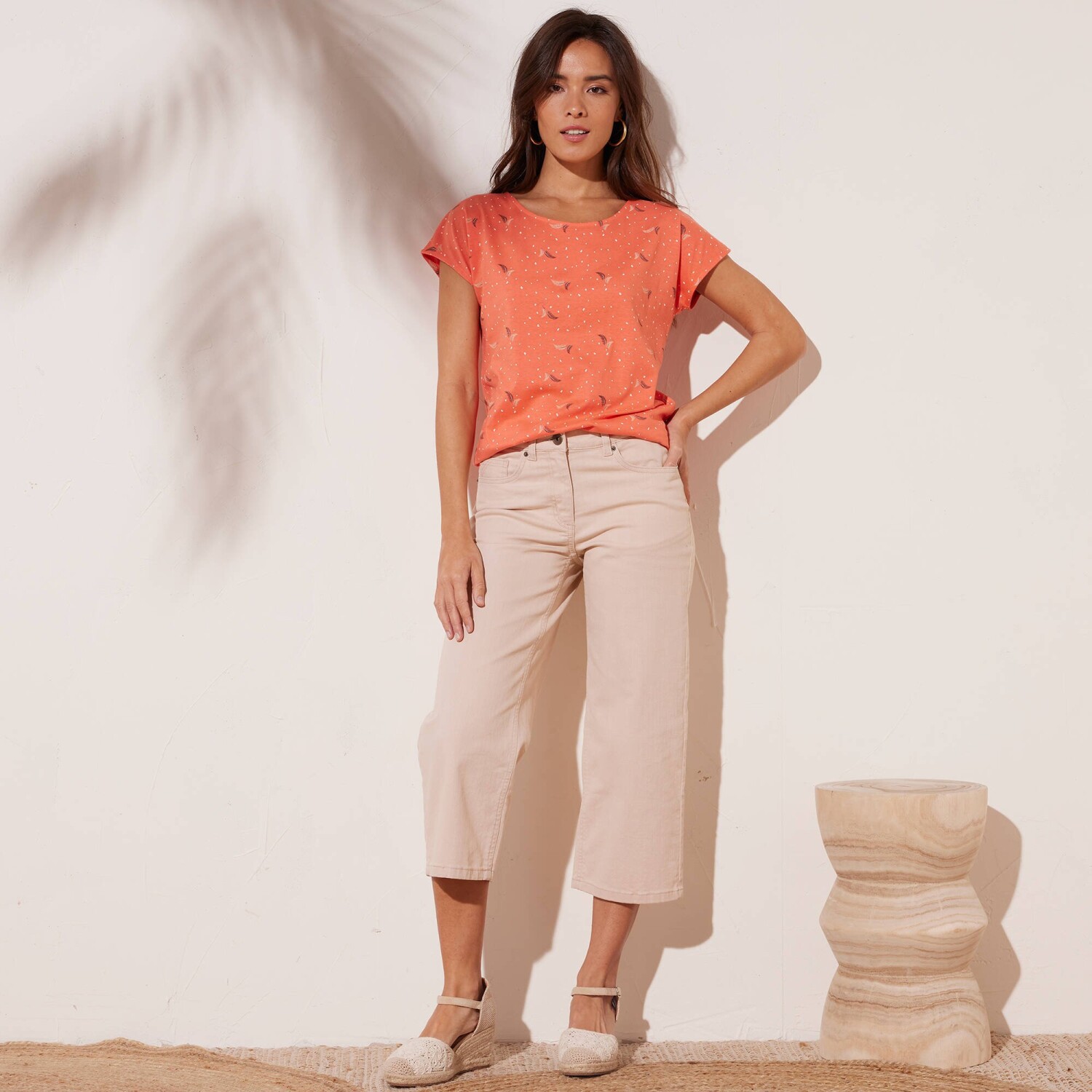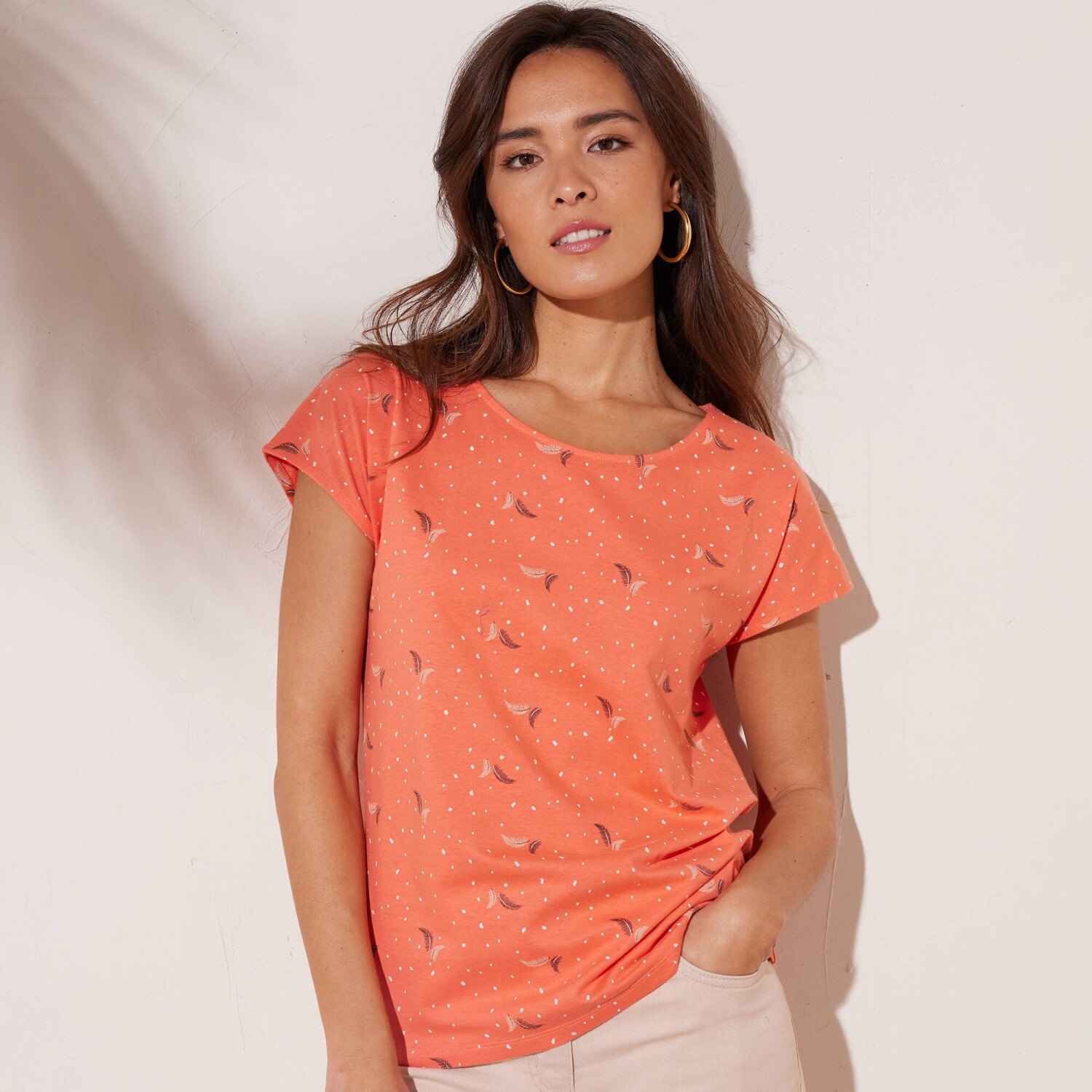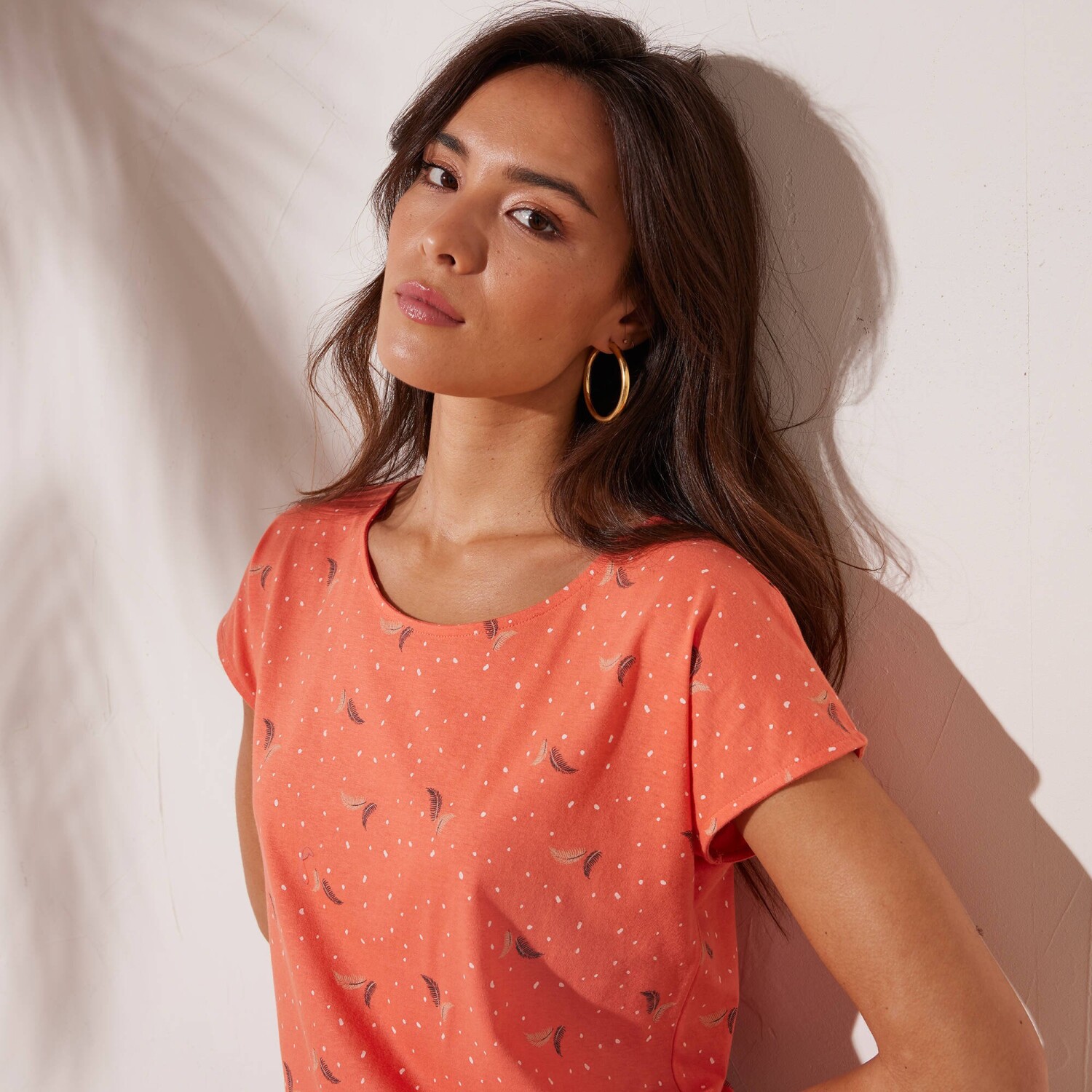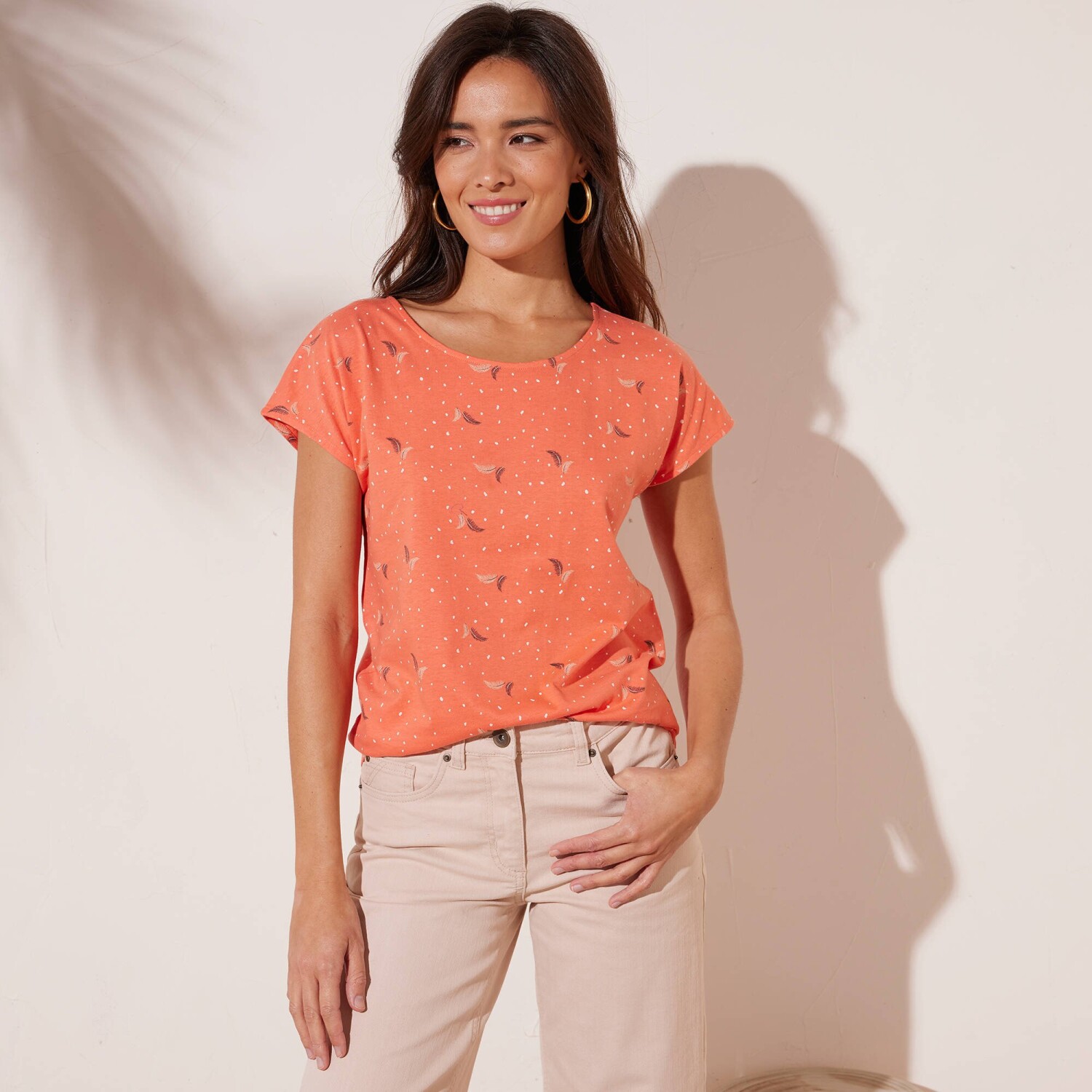 Tricoul uni se remarcă prin mânecile ușor volane și un decolteu frumos cu un amestec de fibre aurii. Confecționat din material elastic ușor. Decolteu în V cu paspoal original extins până la centrul părții din față. Mâneci scurte cu volane. Tiv drept la bază. Se poate spăla la mașină.