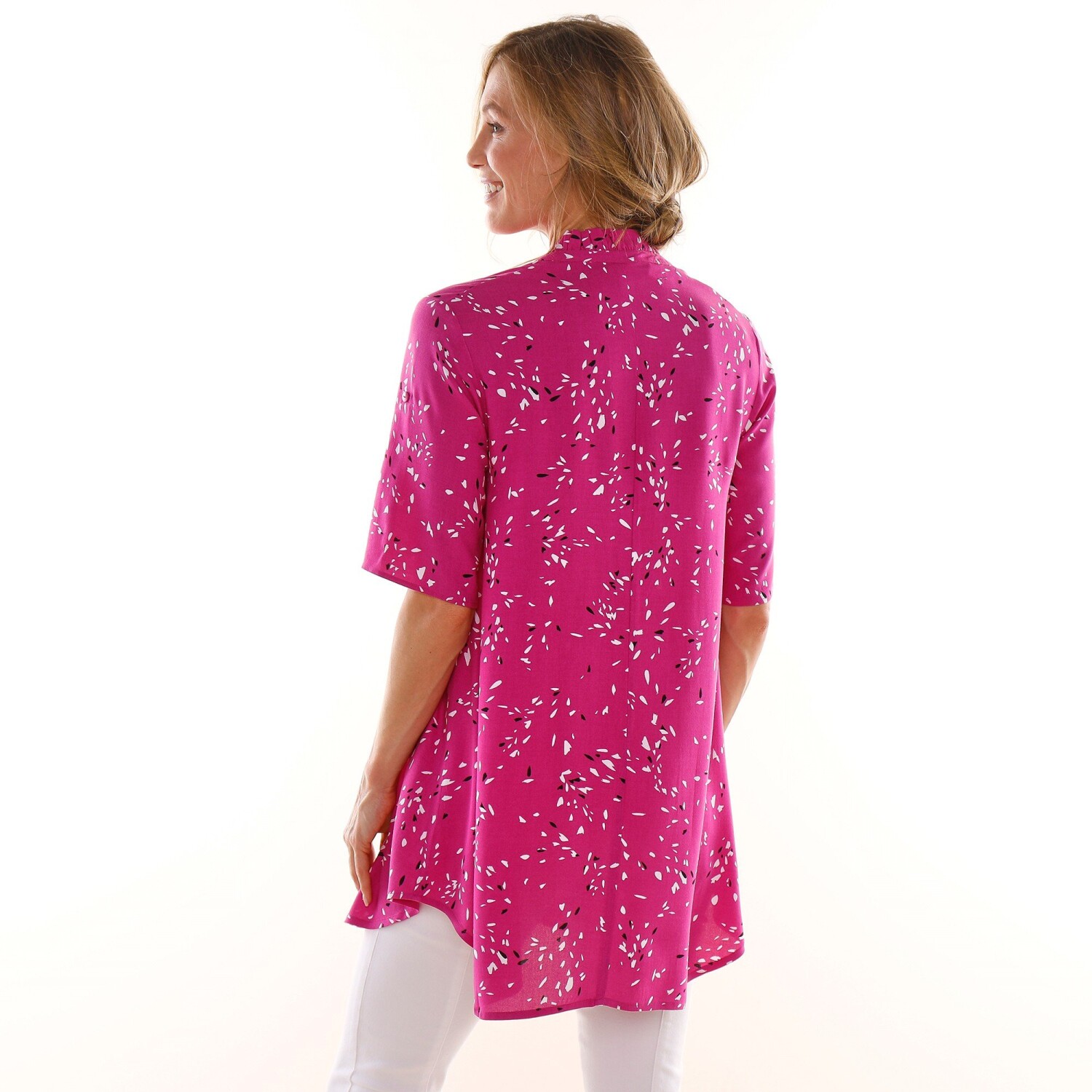 Imprimeul elegant împodobește această tunică cămașă la modă! Guler de cămașă. Fermoar frontal cu nasturi aurii. Fante laterale. Mâneci lungi. Manșete cu nasturi. Se poate spăla la mașină.