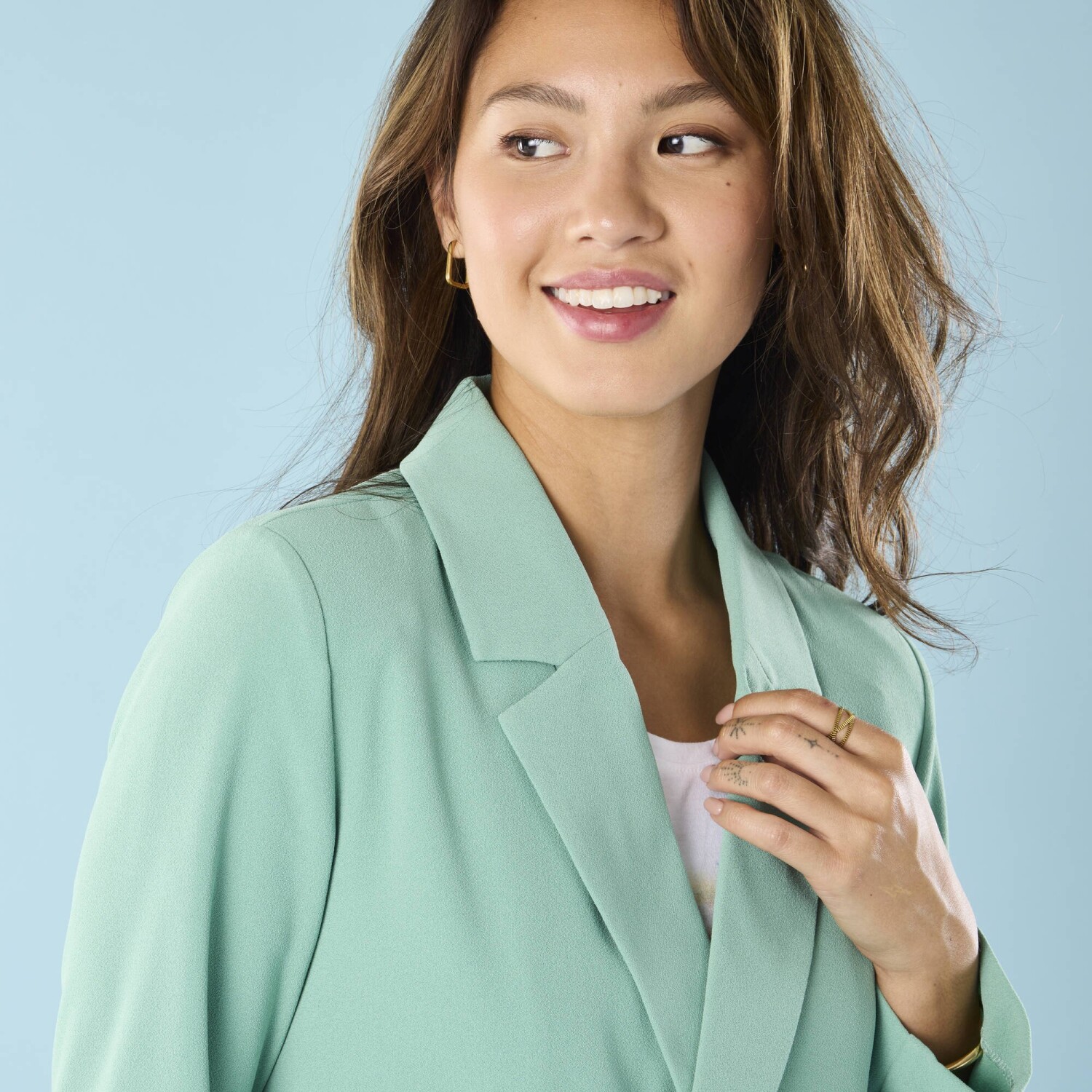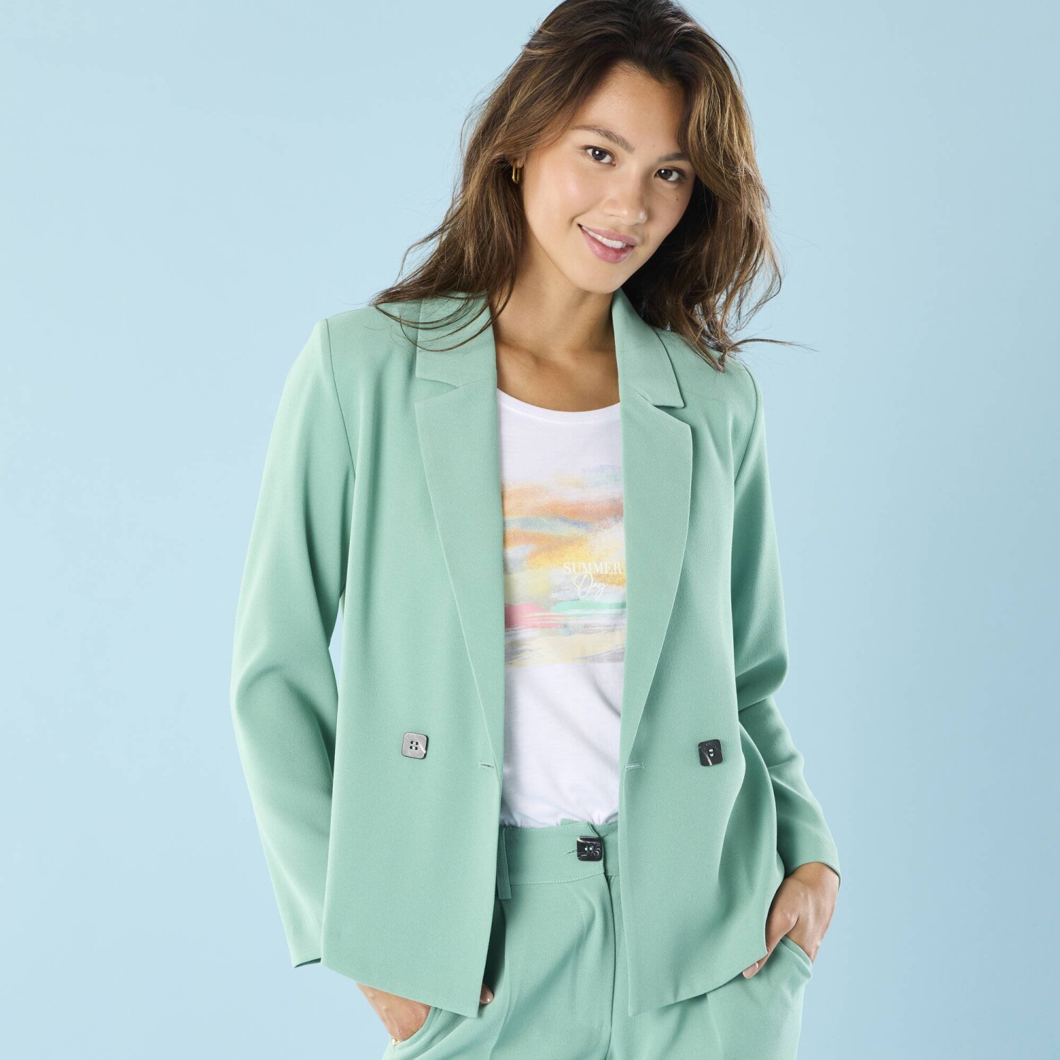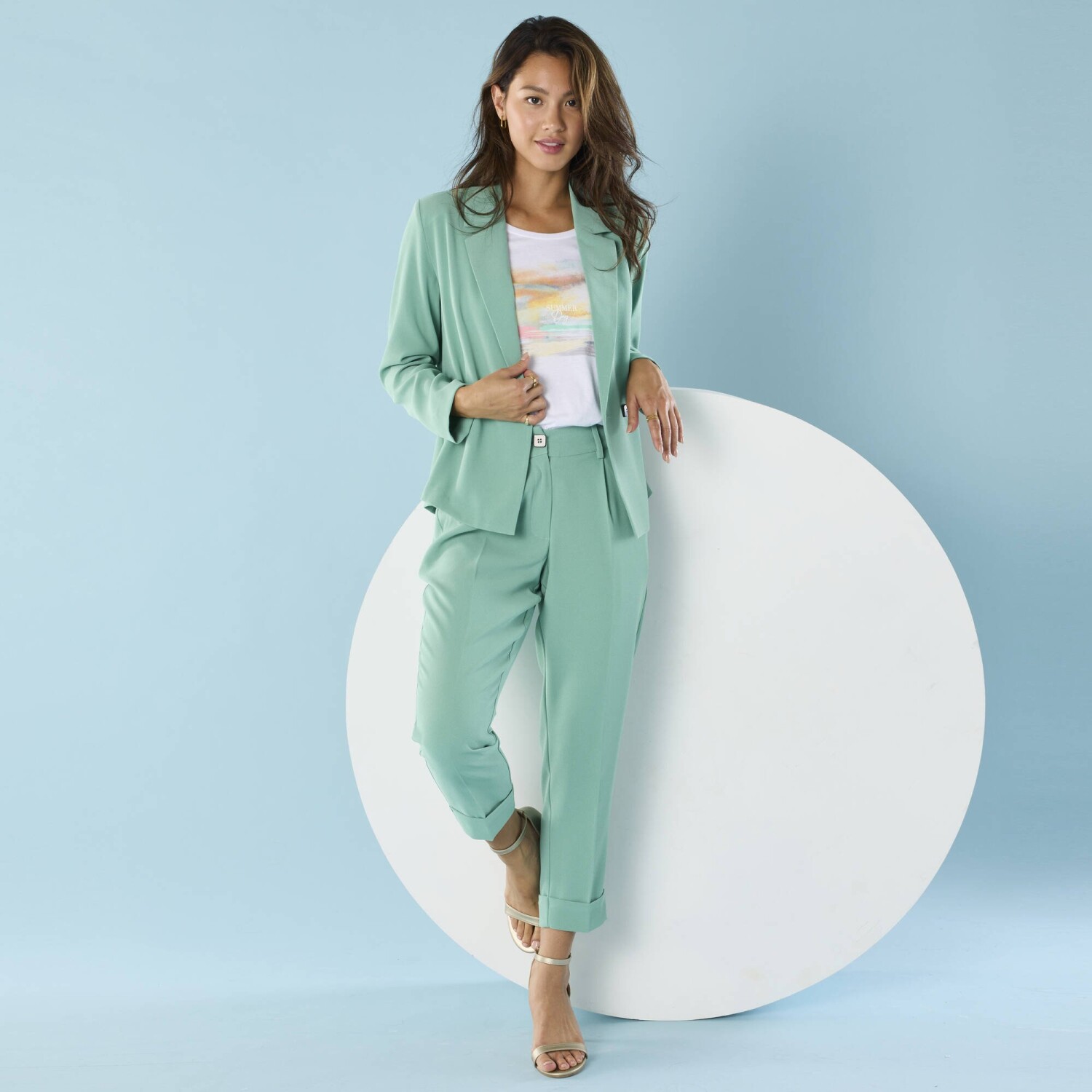 Confortabil, elegant și absolut indispensabil în garderoba unei femei, acesta este un blazer special conceput pentru o siluetă mai mică. Fabricat din țesătură tricotată aerisită, plăcută la purtare. Guler de costum. Croială dreaptă. Curat sub decolteul costumului. Corset cu nasturi încrucișați. Umeri căptușiți. Mâneci lungi. Cusături de la subsuoară la umăr. tiv drept. Capetele mânecilor și marginea de jos sunt finisate cu un tiv ascuns. Se poate spăla la mașină.
