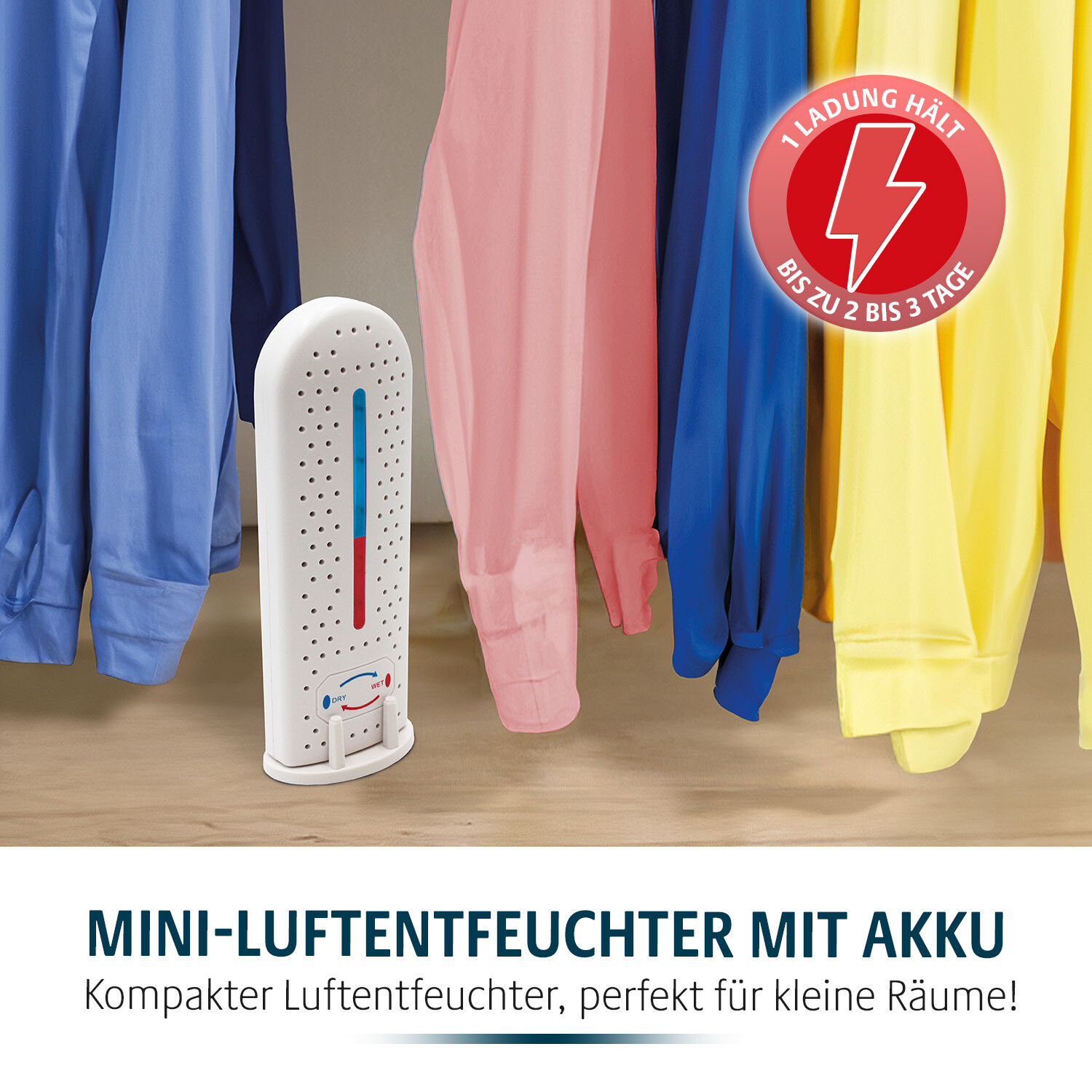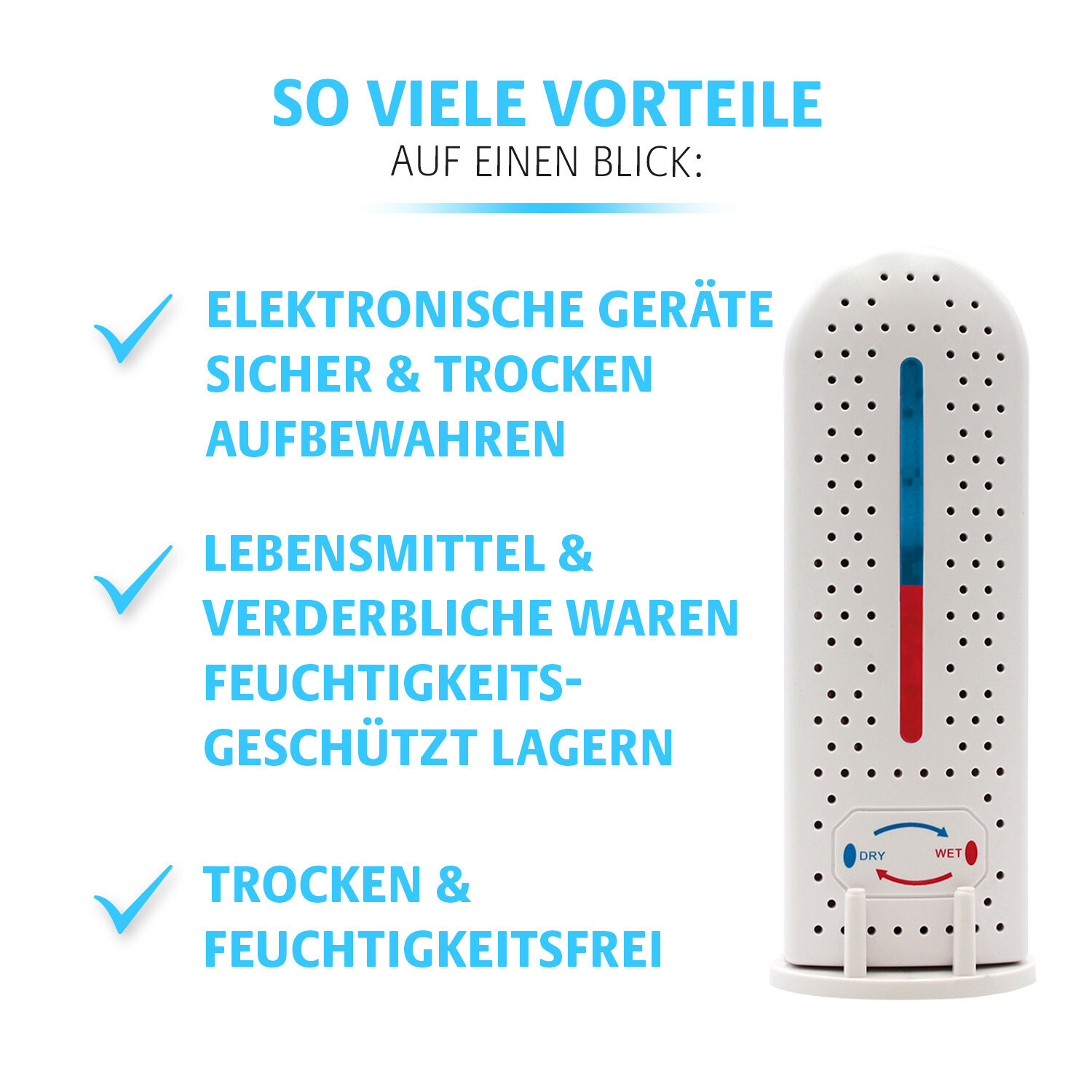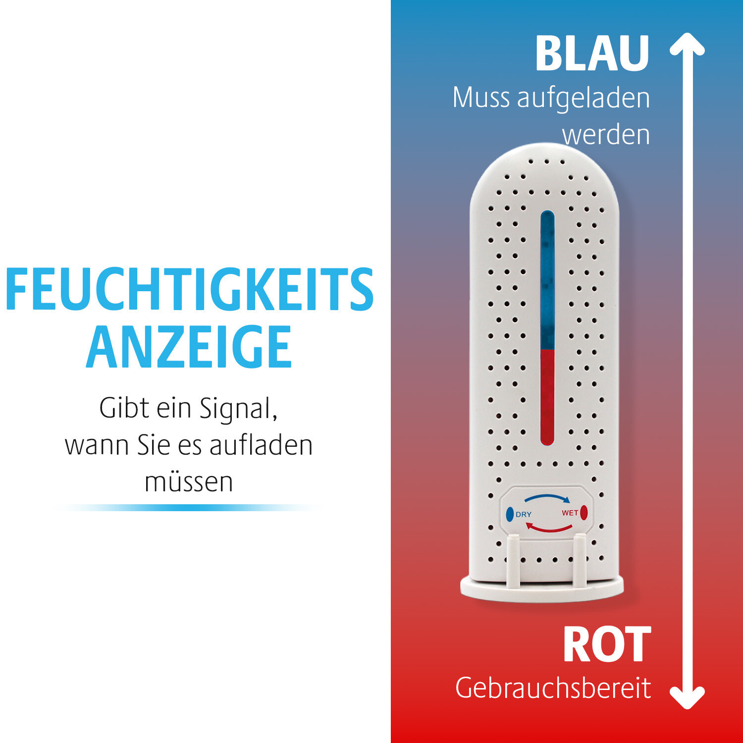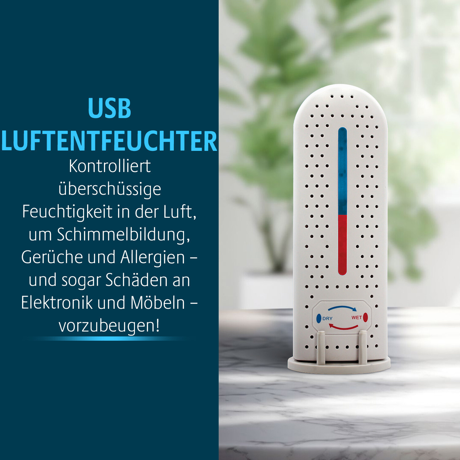 Dezumidificator USB Acest dezumidificator asigură un aer interior bun în cei 4 pereți ai dvs. Cristalele absorb umezeala pentru a preveni mucegaiul și alergiile. Dacă afișajul arată roșu, pur și simplu reîncărcați până când se afișează albastru - pentru un climat optimizat și comod.