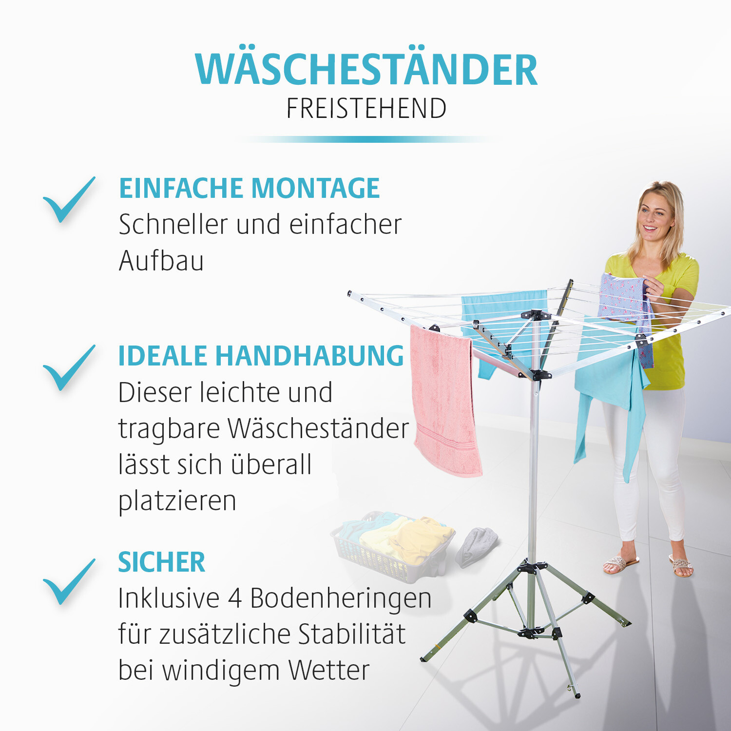 Acest uscător rotativ eficient economiseste spatiu: cu 16 metri de sârmă de uscare, se potriveste perfect în băi, pe balcoane si nu numai. Construit din aluminiu robust pe 4 picioare, cu suporturi suplimentare, este usor, dar stabil chiar si în conditii de vânt. Se montează rapid si se pliază cu usurintă, fără a fi necesare unelte!